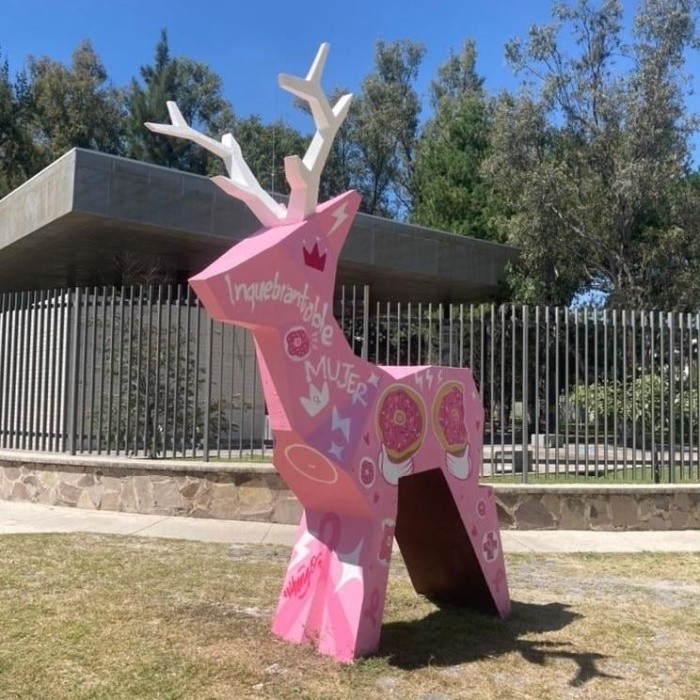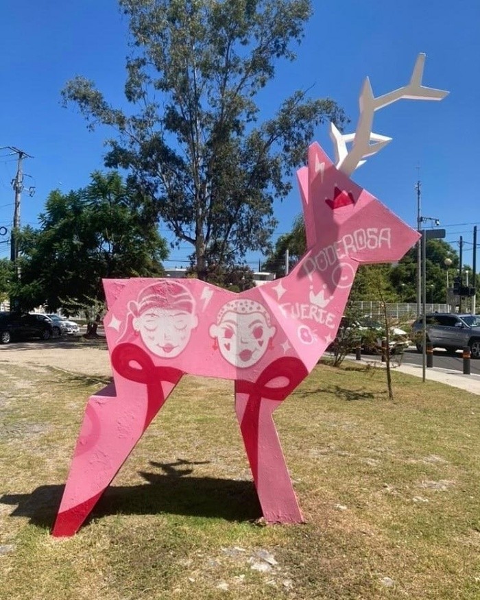 En su participación dentro de Cruz Rosa y en colaboración con Álvaro Cuevas, Magaly Núñez, que se hace llamar MANGO, estuvo feliz de poner su toque de color y creatividad al Venado. En esta pieza hizo un tributo a las mujeres que luchan contra el cáncer de mama y también a las que han salido triunfantes. Mostrar que al final del camino hay una luz de esperanza y que hace florecer a estas mujeres inquebrantables. + de MANGOInició desde niña dibujando con el gusto por el graffiti, gracias a uno de sus hermanos, y de ahí le encantó ir por las calles viendo murales y pintas callejeras .Tomó cursos de pintura y dibujo en el Instituto Cabañas, inició a pintar con aerosol desde 2014 pero ya en forma desde el 2017 cuando comenzó a participar y recibir invitaciones en eventos de graffiti dentro y fuera del Estado hasta el día de hoy. Sus murales y pintas son básicamente usando esa técnica (aerosol) es lo que siempre ha usado y ama toda esa vertiente y cultura. ¿Qué significó para ti participar?"Colaborar pintando una pieza de Álvaro Cuevas para Cruz Rosa significa mucho para mí, puesto que honra a la mujer apoyando y alentando a la prevención de cáncer de mama y ayudando a las que ya lo pasaron, saliendo triunfantes la derrotar este mal. Qué bueno que ya no es tanto tabú ese tema y que debemos enfrentar nuestros miedos. Las mujeres somos bellas por dentro y fuera, me inspiró mucho este tema porque en la lucha nos volvemos inquebrantables. Para mí Álvaro Cuevas es un gran artista y es un honor haber colaborado en una de sus piezas".¿Qué proyectos estás realizando actualmente?"Como tal no tengo más que seguir haciendo arte urbano, progresar más cada día, ya que en cada pinta aprendo algo nuevo de errores y aciertos y seguir dándolo todo. Además de pintar trabajo en más cosas, soy técnica en uñas, lashista (aplico pestañas 1x1) y también comerciante, vendo merch de mis propios diseños y soy mamá de un pequeño de 10 años se llama León". Artista: Magaly Nuñez MANGO.Originaria de: Guadalajara, Jalisco.Edad: 30 años. Título de la Obra: Inquebrantable Mujer.Pieza de Intervención: Venado.Ubicación de la pieza: Unidad deportiva El Polvorín.AA
