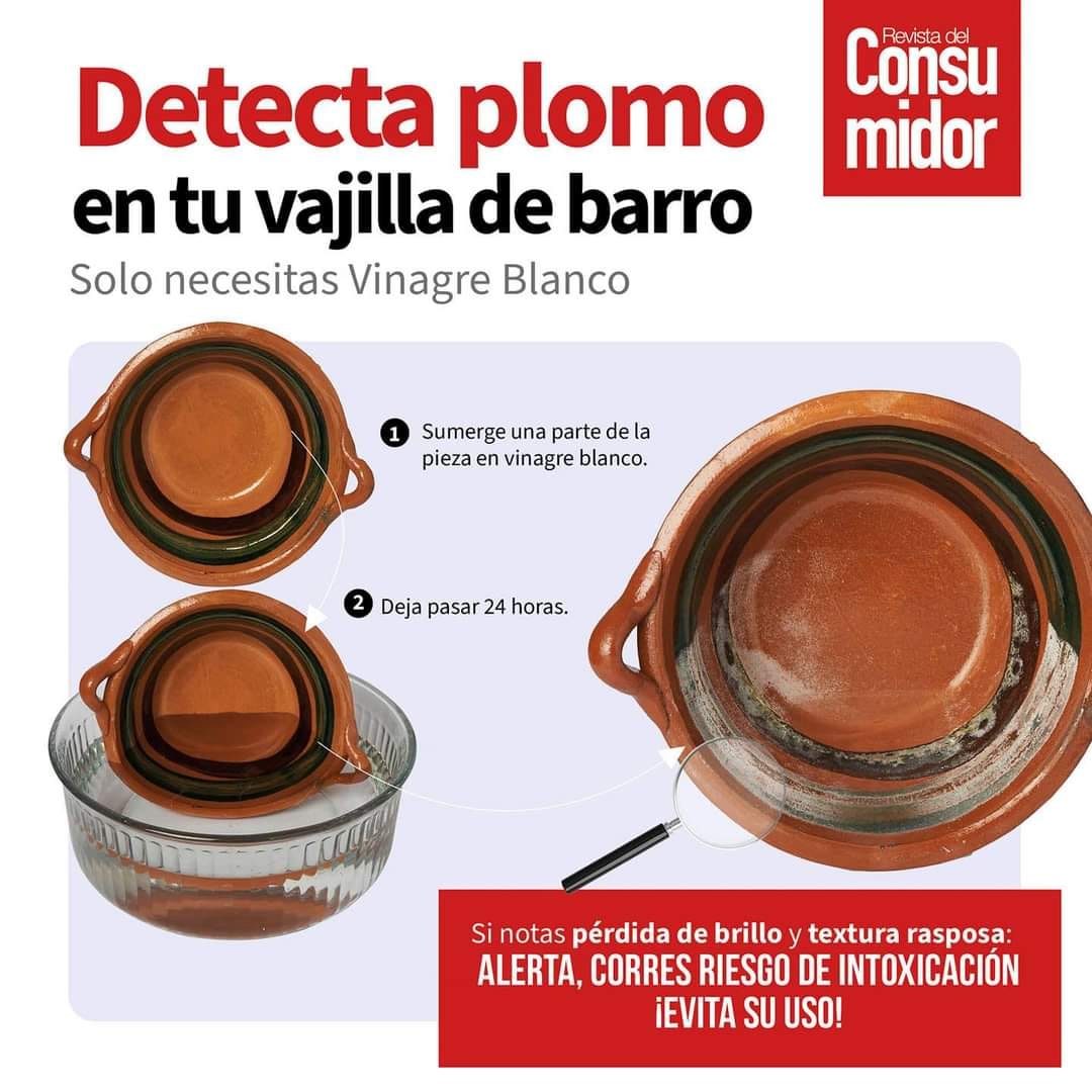 La Revista del Consumidor de la Procuraduría Federal del Consumidor (Profeco) detalla cómo detectar plomo en tu vajilla de barro. Para averiguarlo solamente necesitas vinagre blanco.La Profeco detalla que debes sumergir una parte de la pieza de barro en el vinagre, deja pasar 24 horas.Una vez hecho lo anterior, si notas pérdida de brillo y textura rasposa, esto es una señal de alerta, pues corres riesgo de intoxicación, por lo que se recomienda evitar su uso. El plomo es un elemento tóxico para el cuerpo. Algunas vajillas pueden contener este metal en su esmaltado, por lo que debes estar alerta.*Mantente al día con las noticias, únete a nuestro canal de WhatsApp aquí: https://whatsapp.com/channel/0029VaAf9Pu9hXF1EJ561i03MV