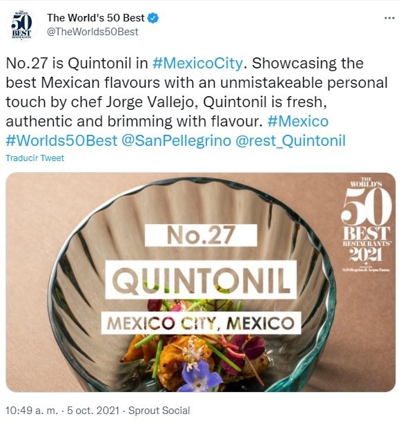 El restaurante danés "Noma", situado en Copenhague, fue elegido este martes como el número uno en la lista de los 50 mejores restaurantes de 2021, entre los que destacan dos establecimientos en México: Pujol y Quintonil.La lista The World's 50 Best Restaurants, que ha regresado esta martes tras una ausencia causada por el COVID19 -la última se publicó en junio de 2019- y como muestra de la progresiva vuelta a la normalidad de uno de los sectores más perjudicados por la pandemia.Este es el ránking completo de los votados como mejores restaurantes del mundo en 2021 por más de mil expertos congregados por la revista británica Restaurant.Si te interesó esta noticia y quieres saber más, entonces descarga y descubre INFORMAPlus, la aplicación digital de EL INFORMADOR, en donde tenemos contenidos exclusivos, seleccionados por nuestros editores, para darles una experiencia más completa a los lectores. Descarga la aplicación y pruébala GRATIS por treinta días. Para iOS: https://apple.co/35jaVgbPara Android: https://bit.ly/3gwVSEVSi eres suscriptor de EL INFORMADOR tu acceso está incluido, solicítalo al 33 3678-7777IM