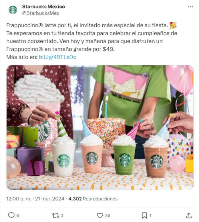 Starbucks está de fiesta este mes de marzo con su bebida estrella, el Frappuccino, por lo que lanzó una increíble promoción. Aquí te damos todos los detalles. Dicha promoción se trata del Frappuccino grande a tan solo 49 pesos durante este jueves 21 y mañana viernes 22 de marzo. Esta oferta está y estará disponible en todas las sucursales Starbucks de México, excepto en los servicios de Delivery como Uber Eats o Rappi, tampoco será válida en aeropuertos y tiendas Reserve bar.No solo es el clásico Frappuccino, sino que Starbucks ha preparado una gran selección de saboresLa promoción es válida desde la apertura de la tienda hasta el cierre de la misma. Cabe mencionar que solo aplica en las bebidas y tamaños participantes.Para poder hacer válida la promoción solo necesitas mencionarla al barista, sin embargo, no es acumulable con otras promociones, cupones, descuentos ni beneficios del programa de lealtad.NA
