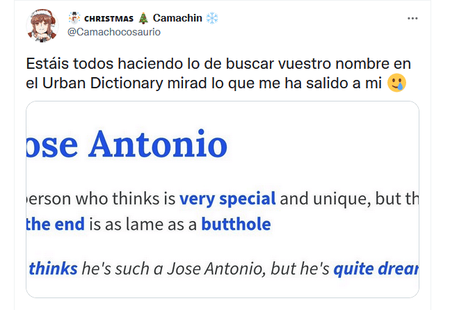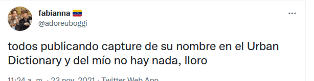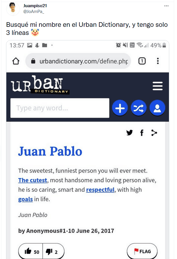 En redes sociales se volvió tendencia la página Urban Dictionary, un diccionario que usualmente se emplea para conocer el significado de palabras, expresiones o abreviaturas en inglés, pero no precisamente por eso. Usuarios han compartido imágenes de lo que, según esta plataforma les dice qué significa su nombre.Miles de usuarios han compartido screenshots en Instagram, Twitter y Facebook, después de que uno de ellos, conocido en redes como @bymayuuu lo hiciera en sus Stories; ahí invitó a que otros lo siguieran.Urban Dictionary revela a los cibernautas lo que quiere decir su nombre a la manera de los horóscopos, pues destaca rasgos de personalidad y carácter.Por ejemplo, define el nombre de "José" como: "Una persona que puede volverte loco pero tan enamorado en 5 segundos. Con quién puedes discutir, pero cuando miras sus grandes ojos, sus largas pestañas eliminan cualquier pensamiento negativo y aún quieres construir una familia con él debido a su naturaleza tranquila, serena y comprensiva", y agrega una frase como "Oh, Dios me dio un José y seguro que no lo tomé".En el caso de "Alma", dice que: "Alma es, literalmente, la persona más dulce y bondadosa que jamás haya existido. Ella siempre está ahí para ti pase lo que pase. Siempre intentará hacerte sentir mejor, ya sea dándote consejos alentadores o simplemente haciendo una de sus muchas bromas. Su personalidad y apariencia son de las que cualquiera se enamoraría". Y completa con "No se puede pedir por nadie mejor que Alma. Ella es como alguien que nunca has conocido antes".Y tú, ¿ya buscaste el significado de tu nombre en Urban Dictionary?Aunque es tendencia en 2021, el proyecto de Urban Dictionary inició en 1999. Como su nombre lo indica, se trata de un "diccionario urbano". Según el blog oficial de la página, su creador es Aaron Peckham, quien a finales del siglo pasado era un estudiante de informática en California que buscaba crear un espacio para documentar todas aquellas palabras que no eran reconocidas en los diccionarios tradicionales, sobre todo, expresiones coloquiales, urbanas (por ejemplo WTF, POV, ICYMI, etcétera).A diferencia de otros sitios de consulta como la Real Academia Española o el diccionario oficial de Oxford, Urban Dictionary no genera sus definiciones a través de la investigación de personas expertas en la lengua. La manera en que recaba la información es con ayuda de usuarios de Internet, quienes de manera voluntaria, como ocurre en otros sitios como Wikipedia, escriben los significados de cada palabra en el sitio.Los neologismos, regionalismos y aquellos términos provenientes de jergas (conocidos como slangs) en inglés son la especialidad del sitio. Así que si alguna vez no llegas a entender aquella nueva palabra de moda que circula en tus redes sociales, Urban Dictionary es una muy buena opción para ponerte al día. Sin embargo, no debes confiar al 100% en las definiciones de esta página. Recuerda que se trata de un proyecto colaborativo que sirve solo como orientación cuando no existen significados oficiales.OF