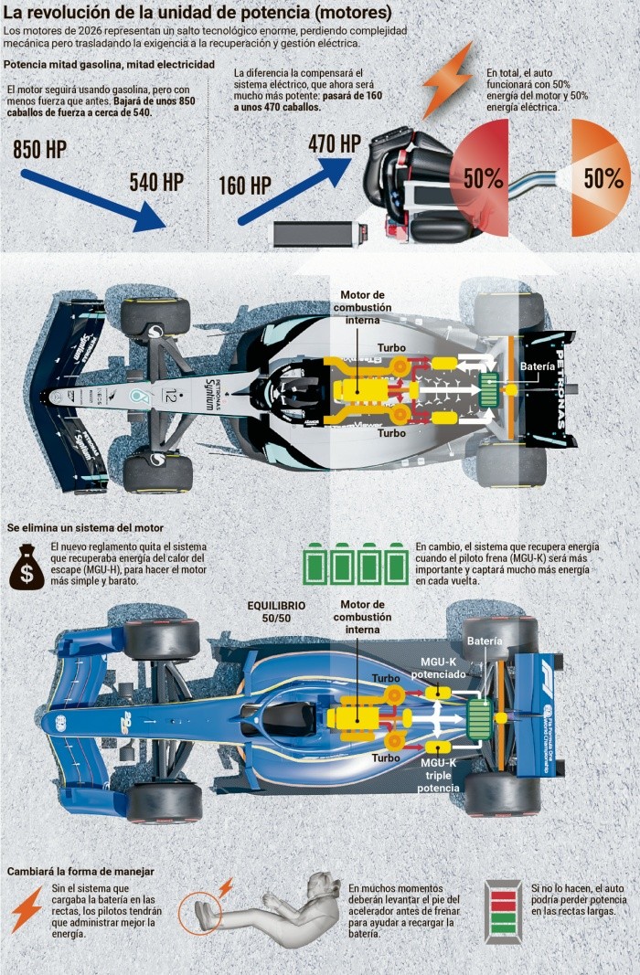La Fórmula 1 pone en marcha la transformación técnica más ambiciosa de su era moderna. El reglamento que entra en vigor a partir de este fin de semana en Melbourne no supone una simple evolución normativa, sino un reinicio estructural que pretende equilibrar sostenibilidad ambiental, control de costos y espectáculo en pista. La Federación Internacional del Automóvil (FIA) ha diseñado un paquete técnico que redefine motor, chasis y aerodinámica. Sin embargo, la magnitud del cambio ha abierto una grieta en el paddock: ingenieros y fabricantes celebran la oportunidad tecnológica, mientras varios pilotos cuestionan el impacto en la esencia competitiva de la categoría.El cambio más radical se encuentra en la unidad de potencia. Se mantiene el bloque V6 turbo de 1.6 litros, pero la arquitectura eléctrica se expande hasta alcanzar una paridad inédita: 50% de potencia eléctrica y 50% térmica. La decisión marca un giro estratégico hacia la electrificación sin abandonar por completo el motor de combustión.La primera gran modificación es la eliminación del MGU-H, el complejo sistema que recuperaba energía de los gases de escape. La FIA argumenta que suprimirlo reducirá costos y simplificará la tecnología, facilitando la entrada de nuevos fabricantes como Audi y el regreso de Ford como socio técnico. En contrapartida, el MGU-K -encargado de recuperar energía cinética en la frenada- triplicará su capacidad, pasando de 120 kW a 350 kW. Esto significa que cerca de 470 caballos de fuerza provendrán exclusivamente del sistema eléctrico. En términos prácticos, casi la mitad del rendimiento del monoplaza dependerá de la gestión energética.A ello se suma el uso obligatorio de combustibles 100% sostenibles. Por primera vez en la historia del campeonato, los motores funcionarán sin carbono fósil, un paso decisivo en la estrategia de neutralidad climática de la categoría. La electrificación implica baterías más pesadas, por lo que la FIA ha rediseñado el concepto de chasis bajo el principio de “agilidad”. Los monoplazas son más pequeños y ligeros que los de 2025.La distancia entre ejes se reducirá de 3.6 a 3.4 metros, mientras que el ancho total pasará de dos a 1.9 metros. En teoría, autos más compactos deberían permitir luchas más cerradas.La gran novedad será la aerodinámica activa. Tanto el alerón delantero como el trasero contarán con dos configuraciones: el Modo Z, diseñado para máxima carga aerodinámica en curvas, y el Modo X, pensado para reducir la resistencia al avance en rectas. Este sistema sustituirá el tradicional DRS como herramienta principal para facilitar adelantamientos.Además, se introduce el Manual Override Mode, un impulso eléctrico adicional que el piloto perseguidor podrá activar cuando se encuentre a menos de un segundo del coche de adelante.RESERVASLas críticas más contundentes a los cambios tan radicales han surgido desde el grupo de campeones. Max Verstappen ha advertido que la elevada dependencia eléctrica podría provocar situaciones en las que los pilotos deban levantar el pie del acelerador en plena recta para recargar batería. En ciertos circuitos de alta velocidad, las simulaciones internas sugieren que los tiempos por vuelta podrían verse comprometidos.Por su parte, Lewis Hamilton ha ironizado sobre la complejidad del nuevo sistema, señalando que casi se necesitará un “doctorado en ingeniería” para gestionar los múltiples parámetros energéticos desde el volante. Fernando Alonso también ha manifestado reservas sobre el equilibrio entre espectáculo y eficiencia.LOS PODEROSOSNo todos comparten el escepticismo. En Mercedes, figuras como George Russell y el joven Kimi Antonelli confían en la capacidad técnica de la escudería para capitalizar la transición. Históricamente, los grandes cambios reglamentarios han beneficiado a estructuras con sólidos departamentos de ingeniería.En Ferrari, la postura es prudente: el foco está en maximizar el desarrollo del nuevo motor para compensar posibles limitaciones aerodinámicas. Mientras tanto, Red Bull y McLaren, además de los ya mencionados, son los favoritos tras los resultados de los test de pretemporada.La FIA, consciente de la controversia, aún dispone de margen para ajustar algunos parámetros. El objetivo declarado es claro: preservar el prestigio de la F1 como cúspide tecnológica del automovilismo, sin renunciar a la sostenibilidad.LA VOZ DEL EXPERTOJosé Antonio Cortés, analistaLa revolución reglamentaria de 2026 en la Fórmula 1 ha encendido el debate dentro y fuera del paddock. Para el analista José Antonio Cortés, la molestia de varios pilotos tiene una raíz clara: el cambio transforma la esencia misma de cómo se conduce un coche.“Los autos ahora serán 50% eléctricos y 50% de combustión interna. Eso modifica por completo la filosofía”, explica Cortés. “A la nueva unidad de potencia se suman la aerodinámica activa y un sistema de adelantamiento que sustituye al DRS por un esquema de energía extra disponible cuando el piloto está a menos de un segundo del rival, además de un botón de ‘boost’ que exige recuperación constante durante la carrera”.Según Cortés, figuras como Max Verstappen, Fernando Alonso y Lewis Hamilton, resienten que el enfoque ya no sea ir siempre al límite. “Ellos están acostumbrados a llevar el auto al máximo en cada vuelta. Ahora no se trata solo de ser el más rápido, sino de gestionar energía y estrategia. Y sienten que eso le resta pureza al automovilismo”.La comparación con la Fórmula E es inevitable. Incluso preocupa que, en ciertos escenarios, los autos sean más lentos que un F2.No todos lo ven igual. Charles Leclerc ha sido menos crítico, mientras que George Russell y Kimi Antonelli observan oportunidades, especialmente si Mercedes capitaliza el nuevo reglamento, tal y como avisó en la pretemporada.Para Cortés, todo depende del cristal con que se mire. Los grandes