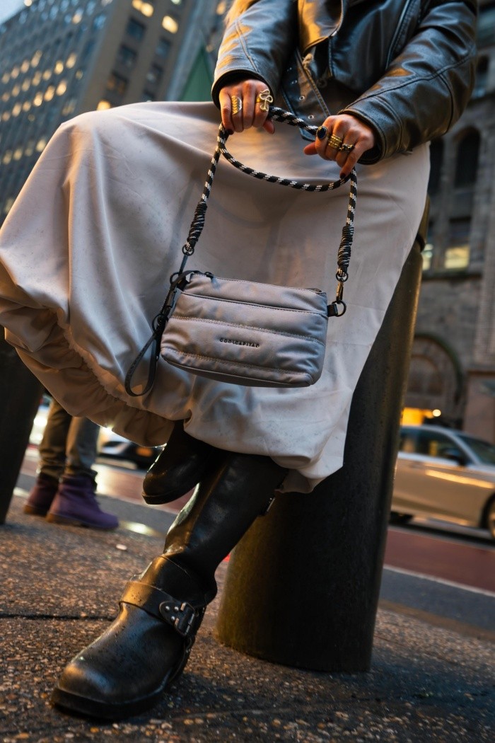 Esta nueva colección está basada en líneas horizontales, con nuevas formas y tejidos, innovando con crossbodies, que cuentan con accesorios para ajustarlo de una manera muy original haciendo nudos al haza, de manera que puedes dimensionar el largo, quitarlo o bien, dejarlo como bolso de mano, dándole gran dinamismo. En cuanto colores hay diferentes tonos de gris, tierra, lila, que es una de las tendencias 2026 que te encantará.