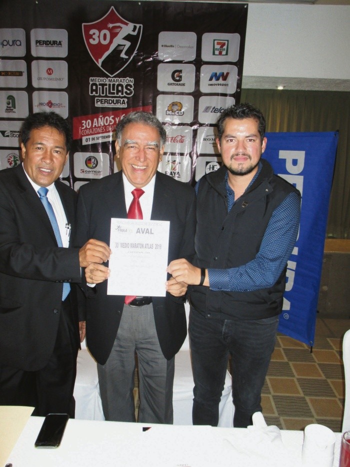 En salón de eventos de un hotel en la Ciudad de México, ubicado en Paseo de la Reforma, frente al Ángel, miembros del comité organizador del Medio Maratón Atlas, encabezados por su director, Saúl Figueroa, dieron los datos de lo que será la edición 30 de este eventoEsta edición que se efectuará el domingo 1 de septiembre del presente 2019, con la participación de seis mil, sí “seis mil corazones que dejarán su huella”.Se recibe avalComo corresponde a este evento que se ha ganado un primerísimo lugar tanto a nivel local, internacional, pero sobre todo en el corazón de todos los corredores, que del uno al seis mil son recibidos como campeones, el presidente de la Federación Mexicana de Asociaciones de Atletismo (FMAA), Antonio Lozano, entregó el aval, que no es más que un reconocimiento a la calidad de esta carrera, al director del comité, Saúl Figueroa, que estuvo acompañado en este acto por Guillermo Camacho, de PERDURA, uno de los patrocinadores importantes.Dos campeones presentesDentro de los atletas invitados estuvieron dos campeones en la historia de 29 años: Dulce María Rodríguez y José Luis Santana, de Jalisco, campeones de 2015, y el actual de la última edición 2018 y con boleto para el maratón de los XVIII Juegos Panamericanos 2019 de Lima, Perú, en los que Dulce tiene medalla de plata en los 10 mil metros en Río de Janeiro, Brasil 2007.Además de Juan Joel Pacheco, de Torreón, Coahuila, que tiene también el boleto uno para Lima, Perú, ambos estuvieron acompañados por su entrenador Enrique Hernández.Otra atleta invitada fue Mitzari Lozano, dentro de la presentación de la edición 30 del Medio Maratón Atlas, en la Ciudad de México.