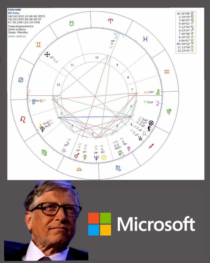 En el artículo anterior se comentó la estrategia que están diseñando un grupo reducido de personas con el fin de dominar el mundo en todos sus aspectos, y para lograr sus objetivos se reúnen todos los años los miembros del "Club Bilderberg" donde además, varios de sus integrantes han formado un club más selecto, una coalición financiera, llamada “BREAK THROUGH ENERGY “ cuyo promotor y líder es el empresario y filántropo BILL GATES. Coalición formada para tomar el control del planeta a través de sus desmesurados proyectos.Analizaremos si esto será posible interpretando la carta astral de Bil Gates. Porque parte del destino de todo lo que conforma e integra nuestro planeta, está escrito en las estrellas, a través de una sintonía cuántica de energía.William Henry Gates III, nació el 28 de octubre de 1955 a las 22:00 horas, en Seattle, Washington, Estados Unidos.Su signo solar está en ESCORPIO, signo lunar ARIES y signo ascendente en CÁNCER.En el momento de nacer había una particular conjunción del planeta Plutón y Júpiter en el signo de LEO, en dirección exacta hacia la estrella de primera magnitud llamada REGULUS, toda esta primera conformación le indica estar marcado por un destino realmente destacable donde la vida le permite tener influencia sobre la humanidad, dotándolo a su vez de una fuerte y desmesurada ambición, que lo conduce a concebir proyectos faraónicos de carácter trascendental para la humanidad.Estas influencias únicas, serían perfectas si no existieran otras configuraciones disonantes que tiñen de negro y se camuflan con acciones y acontecimientos troyanos de carácter negativo, como lo son las malas influencias genéticas y karmicas de su familia, que lo marcan una oposición de la Luna y Marte en su cielo natal y que también lamentablemente le trae megalomanía y perversidad hacia la misma humanidad con sus proyectos faraónicos en una combinación de beneficio y maleficio conjunto.Esto es solo una pequeña síntesis de lo que marca su mapa de nacimiento, por tanto, si damos un recorrido a su biografía veremos que su destino lo llevó a nacer bajo una familia con un ya marcado estigma enfocado hacia la eugenesia, estima que no solo continuará sino que lo consolidará y aumentará con el consiguiente riesgo para la humanidad de convertirse en un depredador, también el destino y "su familia" intervinieron para ayudarlo a catapultarse con el trascendental proyecto de Microsoft dando como resultado el convertirse en "magnate" pero no en uno más, sino de los más grandes, para así tener el poder de intervenir en los destinos de la humanidad sin que nada ni nadie lo detenga, o por lo menos él así lo considera porque está totalmente convencido que será el AMO del mundo, como en su momento también así lo pensaron diferentes personalidades a lo largo de la historia.Realmente debemos de abrir muy bien los ojos y las mentes y estar vigilando las acciones descaradamente encubiertas de este personaje, que pretende manipular y controlar la humanidad, se tiene que apagar el miedo que nos infunde para así encender las conciencias, el mal, nunca ha triunfado sobre el bien.En el próximo capítulo continuaremos interpretando su carta en este presente 2020 y su posible triunfo de sus "beneficos" planes para la humanidad. Según así lo afirma.jpasesorr@gmail.com