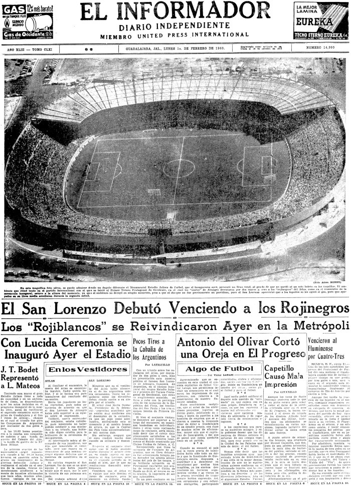 Un día como hoy en 1960 era inaugurado oficialmente el Estadio Jalisco, que iba a convertirse en el escenario de algunas de las más importantes gestas del futbol mexicano y del mundo.Hacia la segunda mitad de la década de los años cincuenta el Parque Martínez Sandoval ya no era suficiente para contener el entusiasmo de los aficionados tapatíos por el futbol. Así surgió la idea de construir un nuevo inmueble a la altura de la ciudad.El INFORMADOR definía la encomienda como una “labor titánica”. Un columnista explicaba que “Hubo muchísimos escépticos, que al saber de los ambiciosos proyectos tapatíos se dieron gusto, calificando de ilusos y hasta de pueriles a los hombres de empresa que se echaron a cuestas la tremenda labor de dotar a Guadalajara de un estadio propio con cupo de muchos miles de aficionados”.Para construir el estadio, los clubes Atlas, Chivas y Oro formaron la Asociación Clubes Unidos de Jalisco, que existe hasta el día de hoy. La labor de Gabriel Bustamante Aguirre fue fundamental para limar las asperezas entre los rivales deportivos que se vieron de pronto convertidos en improbables asociados.El estadio fue construido gracias a las aportaciones de los aficionados tapatíos, que contribuyeron con 15 millones de pesos suscribiendo tres mil Certificados de Fundador Título de Servicio, que les darían acceso al estadio a perpetuidad en localidades especiales asignadas a cada uno de ellos.La Constructora Jalisco fue la encargada de erigir y financiar el coloso, garantizando el pago con el importe de las suscripciones. El costo proyectado inicial, 12 millones de pesos, fue superado para llegar a los 18 millones.La capacidad original del Jalisco era de 44 mil 400 espectadores, que fue ampliada a 65 mil en 1970 para adecuarlo como sede del Mundial de ese año.Una semana antes de su apertura oficial, el estadio recibió la bendición del arzobispo José Garibi Rivera, un chiva de corazón, en una ceremonia a la que asistieron 20 mil personas.El inmueble se inauguró con el Primer Pentagonal Internacional de Occidente, en el que participaron Atlas, Chivas, Oro, San Lorenzo y Sao Paulo. El primer partido fue un Atlas-San Lorenzo disputado el domingo 31 de enero de 1960. Los Zorros, dirigidos por el “Che” Valdatti, cayeron por 2-0 y el primer gol en la historia del inmueble fue anotado por Norberto Boggio.La inauguración no fue perfecta: el marcador no funcionaba, no había agua en los baños de los vestidores ni en los de las tribunas y se verificaron aglomeraciones para tomar los autobuses al final del partido. Aun así, inició un romance entre el público tapatío y su escenario que dura hasta el día de hoy.En 59 años de historia, el inmueble ha sido testigo de victorias, títulos y proezas que son recordadas no sólo en México. El Jalisco fue escenario de muchos de los actos de magia del legendario Brasil de 1970. Los franceses, además, guardan un lugar especial en sus corazones para el coloso de la Calzada, donde Les Bleus se impusieron a Brasil en los Cuartos de Final del Mundial de 1986, un triunfo que es visto como el primer anuncio de los futuros triunfos de la Selección gala.La historia del Jalisco no termina todavía. Sin tener que ir muy lejos, apenas ayer un promotor esbozó la posibilidad de que Saúl “Canelo” Álvarez pelee en el Jalisco para que supere el récord de asistencia impuesto por Julio César Chávez en el Azteca en 1993.Así que feliz cumpleaños, coloso. Felicidades por tu historia, y por todos los capítulos que nos quedan por escribir juntos.