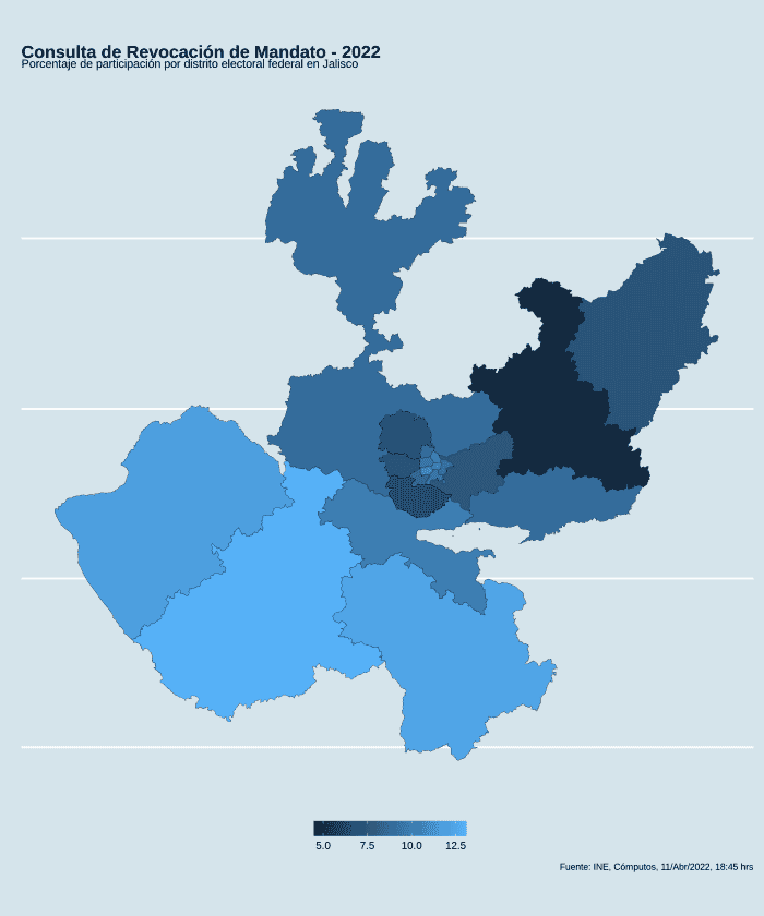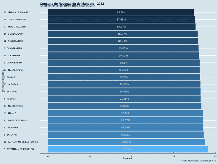Poco más de medio millón de personas que viven en Jalisco salieron a votar durante la consulta de revocación de mandato realizada el pasado domingo. Como en otros estados, ganó por 9 a 1 la opción “Que siga” sobre la respuesta “Que se le revoque”. Hasta ahí, digamos, no hay ninguna novedad o característica particular de lo ocurrido en la consulta con respecto a otros estados. Sin embargo, si revisamos los datos detalladamente, podemos observar rasgos específicos que sin llegar a ser conclusiones, sirven para detonar el análisis y la discusión.A continuación, presento una serie de gráficos que nos permitirán observar algunos detalles de lo que ocurrió en Jalisco.Jalisco fue el estado con menor participación de todo el país. La primera pregunta que surge es si se debe al buen trabajo político y de gobierno de Movimiento Ciudadano, pero existen datos que nos llevan a pensar en un “no” como respuesta. La consulta sobre el Pacto Fiscal en Jalisco tuvo menos participación que la de revocación de mandato, con 555 mil 899 votos sobre 388 mil 816. Además, el gobernador está entre los 10 peor evaluados en México. En síntesis, ser antilopezobradorista no es sinónimo de ser pro Enrique Alfaro.Ahora veamos el sentido del voto. Un total de 11.29% de los jaliscienses que acudieron a la consulta pidieron la revocación de mandato. Es la segunda entidad con la cifra más alta en este rubro, sólo después de Nuevo León. Ambas entidades son gobernadas por Movimiento Ciudadano, pero tampoco podemos considerar esta como una característica influyente en el sentido del voto, pues otros estados como Aguascalientes, Guanajuato y Querétaro (gobernados por otros partidos) también están en el top donde más se pidió la revocación de mandato. Entonces, se trata de estados conservadores, donde la izquierda no ha tenido presencia históricamente. Bien, ¿qué ocurrió en las regiones de Jalisco? En 20 distritos federales hubo una abstención de entre el 86.9% y el 95.51%. Municipios del norte y Zapopan, donde más abstencionismo hubo. Es decir, una zona conservadora y otra de alto poder adquisitivo, en general. Lugares donde las presidencias municipales se reparten entre varios partidos, no sólo son para Movimiento Ciudadano.Este mapa nos permite apreciar que el sur de Jalisco es donde mayor influencia podría tener Morena, al ser la región donde mayor participación se registró el domingo. No obstante, es una zona donde Movimiento Ciudadano tiene mayor dominio en las presidencias municipales.La Zona Metropolitana de Guadalajara, donde domina Movimiento Ciudadano, es donde más se pidió la revocación del mandato del Presidente de la República, con un promedio de 17.91%, casi tres veces de lo que ocurrió a nivel nacional. De los 10 distritos federales con mayor porcentaje de votos por el “que se le revoque”, cuatro pertenecen a Jalisco y cuatro a Nuevo León. En otras palabras, 8 de los distritos más anti obradoristas son gobernados por Movimiento Ciudadano.
