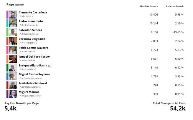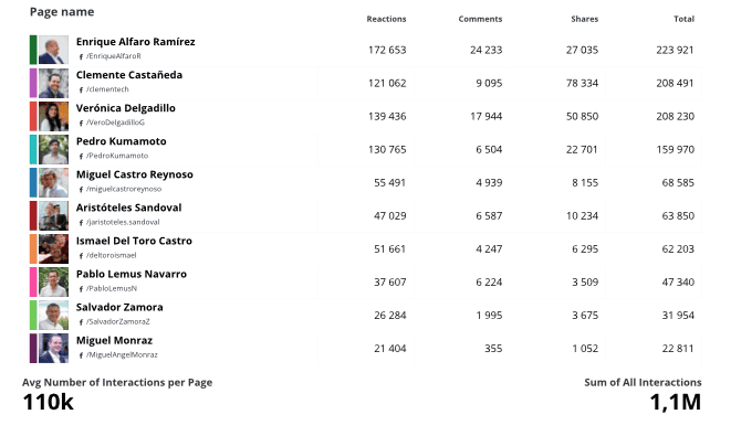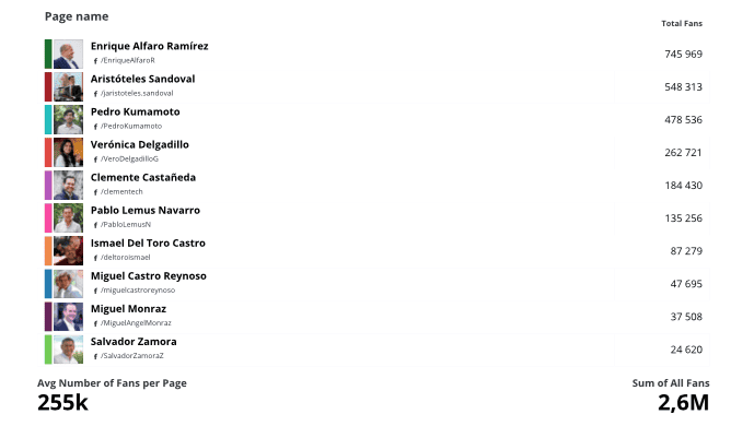 Con las elecciones del 2012, en Jalisco se abandonó la falsa idea de que las redes sociales representan una realidad distinta a la de las calles. Desde entonces han sido el espacio donde los ciudadanos se informan, interactúan y expresan sus opiniones. Son el canal donde políticos y candidatos se encuentran de manera directa con el electorado.Es falsa también la afirmación: “No todos están en las redes”. En México hay 127.5 millones de habitantes y más de la mitad tiene acceso a internet, de acuerdo a la Asociación de Internet [AIMX]. Alrededor de 70 millones de mexicanos mayores de 17 años tienen una cuenta activa en Facebook (la utilizan cuando menos diez veces al mes). Estos datos son similares en Jalisco: de una población de 8 millones, 5.8 tienen acceso a Facebook, prácticamente la misma cantidad de ciudadanos registrados en el listado nominal.El internet está reemplazando a los medios tradicionales como la principal fuente de información sobre política. De acuerdo a la AIMX, 9 de cada 10 internautas interesados en las elecciones de 2018, se informarán sobre el proceso electoral en línea. Las redes sociales se han convertido en el gran campo de batalla electoral, en un indicador fiable para saber qué están consumiendo, reflexionando y discutiendo los ciudadanos y en una herramienta para conocer el ánimo social, mucho más efectiva y certera que las encuestas o los trackings. A través de Internet, sabemos dónde encontrar a los políticos para conocerlos, exigirles explicaciones por sus actos, pedir que atiendan temas en específicos o simplemente mentarles la madre.Comprende del 20 de diciembre de 2017 al 20 de enero del 2018. Se hizo una medición con actores seleccionados por sus aspiraciones en este proceso electoral y su relevancia en redes. Se consideró como indicador principal el número de interacciones, para determinar quiénes son los 10 actores con mayor relevancia en Facebook en Jalisco. ¿Dónde se concentra la conversación?Los actores de Movimiento Ciudadano aglutinan el 71% de la conversación, Pedro Kumamoto 14%, la pareja del PRI apenas el 12% y en el fondo Miguel Monraz del PAN con un 2%.Movimiento Ciudadano es la fuerza política con más actores en el top 10Enrique Alfaro es el actor que genera mayor interacción. En el segundo y tercer puesto se encuentran, practicamente empatados, Clemente Castañeda y Verónica Delgadillo respectivamente. Ismael del Toro está la séptima posición, Pablo Lemus en la octava y Salvador Zamora en la novena.Enrique Alfaro, Clemente Castañeda y Verónica Delgadillo son los actores con mayor relevancia en las redes en JaliscoLa tercia de actores tiene más de 200 mil interacciones cada uno: Alfaro (223,991), Castañeda (208,491) y Delgadillo (208,230). Superan a Pedro Kumamoto (159,970) y a los dos actores del PRI que juntos apenas alcanzan 132,435 interacciones.¿Dónde está el PRI?El PRI tiene solo 2 actores en el top 10, pero están muy lejos del interés que generan los primeros lugares de la lista: Miguel Castro se ubica en el quinto lugar con 68,585 interacciones, seguido en sexto lugar por el gobernador Aristóteles Sandoval con 63,850.El PRI tiene poca interacción en redesLa suma de interacciones de los dos actores de este partido (132,435) es mucho menor que la de Enrique Alfaro (223,921), Clemente Castañeda (208,491) o Verónica Delgadillo (208,230). En este indicador el PRI es superado casi seis a uno por el bloque de actores de Movimiento Ciudadano (782,139); y están por debajo de Pedro Kumamoto (159,970).El PAN en el fondoMiguel Monraz es el único panista en el top 10, pero se encuentra en el último lugar de los indicadores en interacción (22,811) y crecimiento de seguidores (339).Morena no existe en FacebookNingún actor de MORENA tiene interacciones suficientes para estar dentro del top 10. No son relevantes en la discusión digital.Enrique Alfaro, el más seguidoAlfaro tiene 745,969 seguido por Aristóteles Sandoval (548,313), Pedro Kumamoto (478,536), Verónica Delgadillo (262,721), Clemente Castañeda (184,430) y Pablo Lemus (135,256). El resto de los actores no superan los cien mil seguidores.Movimiento Ciudadano: la fuerza política con más seguidoresLos actores de Movimiento Ciudadano acumulan 1,440,275 seguidores, más del doble que los del PRI con apenas 596,008.Movimiento Ciudadano tiene 4 de los 5 actores con mayor crecimientoClemente Castañeda (10,406) es quien más creció en el periodo analizado; en tercer lugar está Salvador Zamora (8,168), seguido de Verónica Delgadillo (7,003), Pablo Lemus (6,723), Ismael del Toro (5,631) respectivamente. Pedro Kumamoto (10,244) se encuentra en el segundo lugar. Ningún actor del PRI y del PAN está creciendo significativamente en el terreno digital.Verónica Delgadillo es la única mujer en el top 10Es además tercer lugar en interacciones y cuarto en número de seguidores y crecimiento durante el periodo analizado.Sólo dos millenials en el top 10Verónica Delgadillo (208,230) y Pedro Kumamoto (159,970) son los únicos jóvenes jaliscienses en el escenario político que generan una conversación relevante.Verónica Delgadillo, la millennial que genera más conversaciónPedro Kumamoto tiene casi el doble de seguidores (478,536) que Verónica Delgadillo (262,721), pero la diputada federal supera en interacciones (208,230) al independiente (159,970), es decir, genera más conversación a pesar de tener 45% menos seguidores.Los candidatos a gobernadorEn el terreno de las redes sociales no hay competencia: Enrique Alfaro de Movimiento Ciudadano tiene 15 veces más seguidores y tres veces más interacciones que Miguel Castro del PRI.Los candidatos al SenadoClemente Castañeda y Verónica Delgadillo de Movimiento Ciudadano llevan la delantera frente a la fórmula independiente. Un factor determinante es Juanita Delgado, compañera de fórmula de Pedro Kumamoto, que tiene tan solo 1,507 interacciones, apenas 1,193 seguidores y un práct