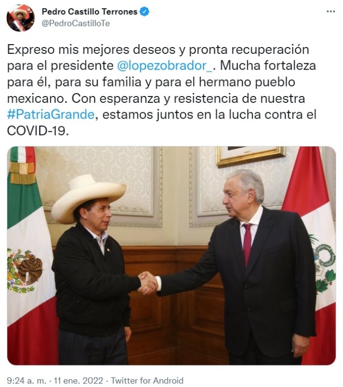 Pedro Castillo, presidente de Perú, envió saludos y deseos de pronta recuperación al Presidente Andrés Manuel López Obrador (AMLO), luego de que el Mandatario mexicano diera positivo por segunda ocasión al COVID-19.Pedro Castillo escribió en su cuenta de Twitter:"Expreso mis mejores deseos y pronta recuperación para el presidente @lopezobrador".Castillo acompañó su mensaje de una foto con López Obrador."Mucha fortaleza para él, para su familia y para el hermano pueblo mexicano. Con esperanza y resistencia de nuestra #PatriaGrande, estamos juntos en la lucha contra el COVID-19", añadió el jefe de Estado peruano, que hace unos días recibió el refuerzo de la vacuna contra la pandemia.A diferencia de Perú, donde las autoridades aplicaron nuevas restricciones y medidas ante el inicio de la tercera ola de contagios, AMLO comentaba previo a las fiestas de fin de año que no eran necesarias las restricciones."Hay la polémica sobre si nos reunimos o no por esta nueva variante (ómicron), que lo hagamos con cuidado, pero que sí procuremos reunirnos con nuestros seres queridos, que es muy importante vernos, es algo bellísimo el encontrarnos", declaró López Obrador el pasado 22 de diciembre.El pasado sábado México batió el récord de contagios diarios al llegar a los 30 mil 671, por encima de los 28 mil 953 del 18 de agosto de 2021.A estas cifras se le sumó el viernes la superación de los 300 mil muertos oficiales por COVID-19, datos que consolidan al país como el quinto en el mundo en números absolutos de decesos por esta enfermedad.AMLO informó el lunes, a través de sus redes sociales, que estaba contagiado, con síntomas leves y que permanecerá en aislamiento, realizando trabajo de oficina y comunicación virtual.OA