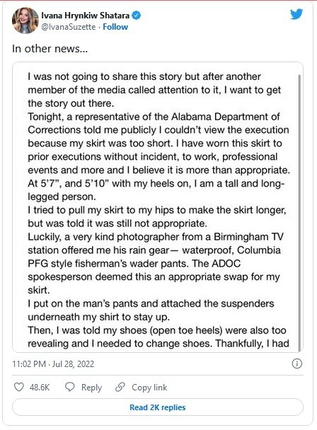 La reportera Ivana Hrynkiw Shatara de AL.com se vio obligada a cambiarse de ropa al asistir a una ejecución después de que un miembro del personal del Departamento Correccional de Alabama dijera que su falda era demasiado corta.El integrante del Departamento le mencionó que su atuendo era "inapropiado" y "demasiado revelador", por lo que le prohibieron unirse a otros periodistas para ver la inyección letal aplicada al asesino convicto Joe Nathan James.James, de 50 años, fue condenado y sentenciado a muerte por la muerte a tiros en 1994 de su exnovia, Faith Hall, de 26 años.El oficial del Departamento Correccional de Alabama le dijo a Shatara que sus 'tacones abiertos' también eran inapropiados."Afortunadamente, un fotógrafo muy amable de un canal de televisión de Birmingham me ofreció su equipo (...) pantalones impermeables de pescador estilo Colombia PFG", declaró la comunicadora."El portavoz (...) consideró que este era un cambio apropiado para mi falda. Me puse los pantalones del hombre y até los tirantes debajo de mi camisa (...)"También la periodista tuvo que correr a su auto y ponerse tenis, antes de que se le permitiera volver a entrar para continuar con su trabajo."He usado esta falda en ejecuciones anteriores sin problemas, en el trabajo, en eventos profesionales (...) y creo que es más que apropiada", escribió Shatara en Twitter el jueves por la noche.Shatara le dijo al The New York Post que llevaba una falda negra de línea A de la marca Philosophy. "Midiendo 5’7, y 5’10" con mis tacones puestos, yo soy una persona alta de piernas largas", describió."Yo traté de bajar mi falda hasta las caderas para hacerla más larga, pero me dijeron que aún así era inapropiada", agregó."Esta fue una situación incómoda y me sentí avergonzada de que mi cuerpo y mi ropa fueran cuestionados frente a una habitación llena de personas que en su mayoría nunca había conocido", escribió. "Me senté, traté de dejar de sonrojarme e hice mi trabajo".Kelly Ann Scott, editora en jefe y vicepresidenta de contenido de Alabama Media Group criticó al Departamento, por lo que llamó "trato inaceptable y desigual". "Esto fue sexista y una violación atroz de la conducta profesional. Y no debería volver a pasarle a ningún otro reportero", dijo Scott.JM