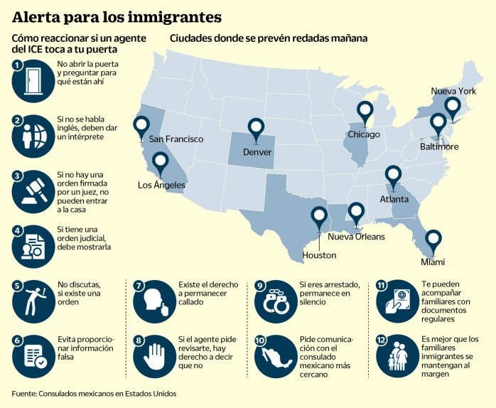 “Vamos a sacar de aquí a miles”, dijo el presidente de Estados Unidos, Donald Trump, en referencia a las personas de cualquier nacionalidad que viven en ese país de forma irregular y confirmó que las redadas con ese fin comienzan mañana. Ante lo anterior, consulados de México en la Unión Americana intensificaron sus campañas de información sobre derechos de los migrantes en caso de ser detenidos.Las sedes diplomáticas en Nueva York, Washington y Los Ángeles, por ejemplo, plantearon recomendaciones en caso de que algún mexicano sea detenido; no oponer resistencia, comunicarse con el consulado y no firmar documentos que no comprendan, son algunas de las sugerencias.El Servicio de Inmigración y Control de Aduanas (ICE) hará las redadas a nivel nacional y se enfocará inicialmente en familias migrantes que tienen órdenes judiciales de deportación. La estrategia se aplicará en 10 ciudades, consideradas como santuario para los indocumentados.Trump amenazó hace tres semanas con lanzar la misma operación, pero la contuvo un día antes de su comienzo para dar una “oportunidad” a los legisladores demócratas de ese país de negociar con él un cambio en el sistema de asilo.Las redadas se realizan regularmente desde 2003. La alcaldesa de Chicago, Lori Lightfoot, reforzó las medidas de protección que ofrece la ciudad a los indocumentados, en vísperas del comienzo de las redadas con fines de deportación anunciadas por el presidente de Estados Unidos, Donald Trump.“Chicago ha sido por mucho tiempo un defensor de los derechos de los inmigrantes y refugiados, y apoyamos hombro con hombro a nuestros vecinos, para estar seguros de que sean defendidos, sin importar su estatus legal”, declaró en un comunicado.Lightfoot firmó un paquete de acciones ejecutivas que incluyen un aumento de 20%, lo que significa 250 mil dólares, en el fondo de protección legal de la alcaldía, que suministra abogados a todos los indocumentados que deban comparecer en las cortes.Asimismo, dio instrucciones directas a las escuelas públicas, bibliotecas, edificios del Distrito de Parques y centros de atención de ancianos para que reciban a todas las personas que busquen refugio ante la eventualidad de una redada.En todos los casos, los agentes de la Oficina de Inmigración y Aduanas (ICE, por sus siglas en inglés) no podrán ingresar a esas instalaciones a menos que presenten una orden judicial, comprobable, de que buscan a personas con antecedentes criminales.El Departamento de Policía de Chicago no compartirá sus bancos de datos con la agencia de inmigración ni facilitará el acceso de agentes de ICE a domicilios de familias inmigrantes.“De manera muy clara estamos diciendo que el odio no tiene cabida en nuestra ciudad y que no toleraremos que ICE destruya familias y comunidades”, dijo la alcaldesa.Chicago ofrece protección, lo que en la Unión Americana se denomina “santuario”, a los indocumentados desde 1986 y desde el año pasado rige una ley que extiende la protección a todo el Estado de Illinois.“No les abran la puerta”El procurador de esa Entidad, Kwame Raoul, declaró que, sin importar lo que el presidente Donald Trump “quiere hacer creer a la gente”, en Illinois todos los residentes tienen derechos constitucionales.“A todos les pido que no les abran la puerta a los agentes de inmigración”, dijo Raoul, quien exhortó a las agencias policiales del Estado a no violar esos derechos.Manifestantes, con velas y pancartas en mano, se sumaron a una vigilia colectiva en distintos puntos de Estados Unidos y de varios países para pedir al Gobierno del presidente Donald Trump el cierre de los centros de detención de migrantes, que los organizadores califican como campos de concentración.En Washington, centenares de personas se concentraron en Lafayette Square, una plaza a escasos pasos de la Casa Blanca, en respuesta a una convocatoria que tenía como otros puntos claves El Paso (Texas), Miami, San Diego (California) y Nueva York.“Clases no jaulas”, coreaban los manifestantes, entre los que se contaban activistas, maestros, inmigrantes, religiosos y la congresista del Partido Demócrata, Norma Torres, nacida en Guatemala.“Todos aquí somos americanos, todos aquí vinimos a buscar un futuro mejor y no es criminal venir aquí a pedir asilo”, dijo en español Torres al dirigirse a los asistentes y aseguró que los responsables de las muertes en la frontera con México son los “presidentes de los países del Triángulo Norte” y la Administración estadounidense, a la que señaló de estar “incriminando el simple pedido de asilo”.Autoridades migratorias comenzaron a llegar ayer al área agrícola de Immokalee, en el Suroeste de Florida y con gran población hispana, como parte del plan de redadas masivas en 10 ciudades de EU.Residentes de Immokalee, en el condado de Collier, reportaron fuerte presencia de oficiales del Servicio de Inmigración y Aduanas.Se trata de una comunidad agrícola con alrededor de 27 mil habitantes, en su gran mayoría hispanos, y que no estaba incluida en las 10 ciudades en las que, se cree, se centrarán las redadas del Gobierno federal.