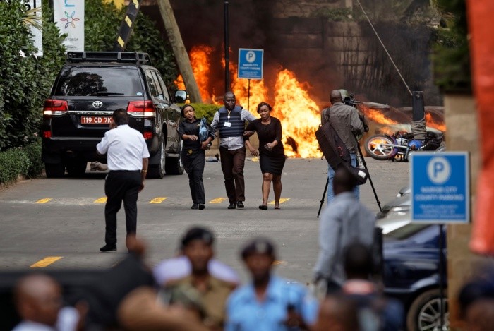 Un complejo hotelero de lujo en la capital de Kenia fue atacado este martes con una explosión y un fuerte tiroteo. El grupo extremista Al Shabab, con sede en la vecina Somalia, se atribuyó la responsabilidad y dijo que sus miembros seguían luchando en la zona.Testigos y policías en el lugar de los hechos lo describieron como el ataque terrorista más reciente en un país que ha visto varios ataques mortíferos en los últimos años.El ataque ocurrió en el vecindario de Westlands, que alberga al lujoso hotel DusitD2 además de varios bancos y oficinas. Varios vehículos estallaron en llamas y numerosas personas fueron evacuadas del lugar.Los disparos duraron varios minutos tras ser reportados inicialmente. Emanaba una espesa nube de humo negro de la zona."Hemos enviado agentes al lugar, incluso de la unidad antiterrorista, pero aparte de eso no tenemos más información" dijo el portavoz policial Charles Owino.Acudieron al lugar ambulancias, patrullas policiales y camiones de bomberos, con las sirenas sonando. Un gran grupo de mujeres fue evacuado de la zona por las fuerzas de seguridad. Luego otros grupos fueron sacados a medida que la policía fue de tienda en tienda.Presuntos policías vestidos de civil se acercaron lentamente al lugar, armas en mano, entre el ruido de helicópteros desde el cielo. Otros transeúntes se refugiaron detrás de fuentes de agua u otros objetos en el lujoso complejo al aire libre.El ataque trajo recuerdos del asalto contra el centro comercial Westgate Mall en Nairobi en 2013, cuando extremistas de Al Shabab irrumpieron en el lugar lanzando granadas y desatando un asedio que duró varios días y que dejó 67 muertos.El ataque ocurre exactamente tres años después de que extremistas de Al Shabab atacaron una base militar keniana en la vecina Somalia, matando a decenas de personas. Al Shabab se opone a la presencia militar keniana en esa turbulenta nación del Cuerno de África.OF