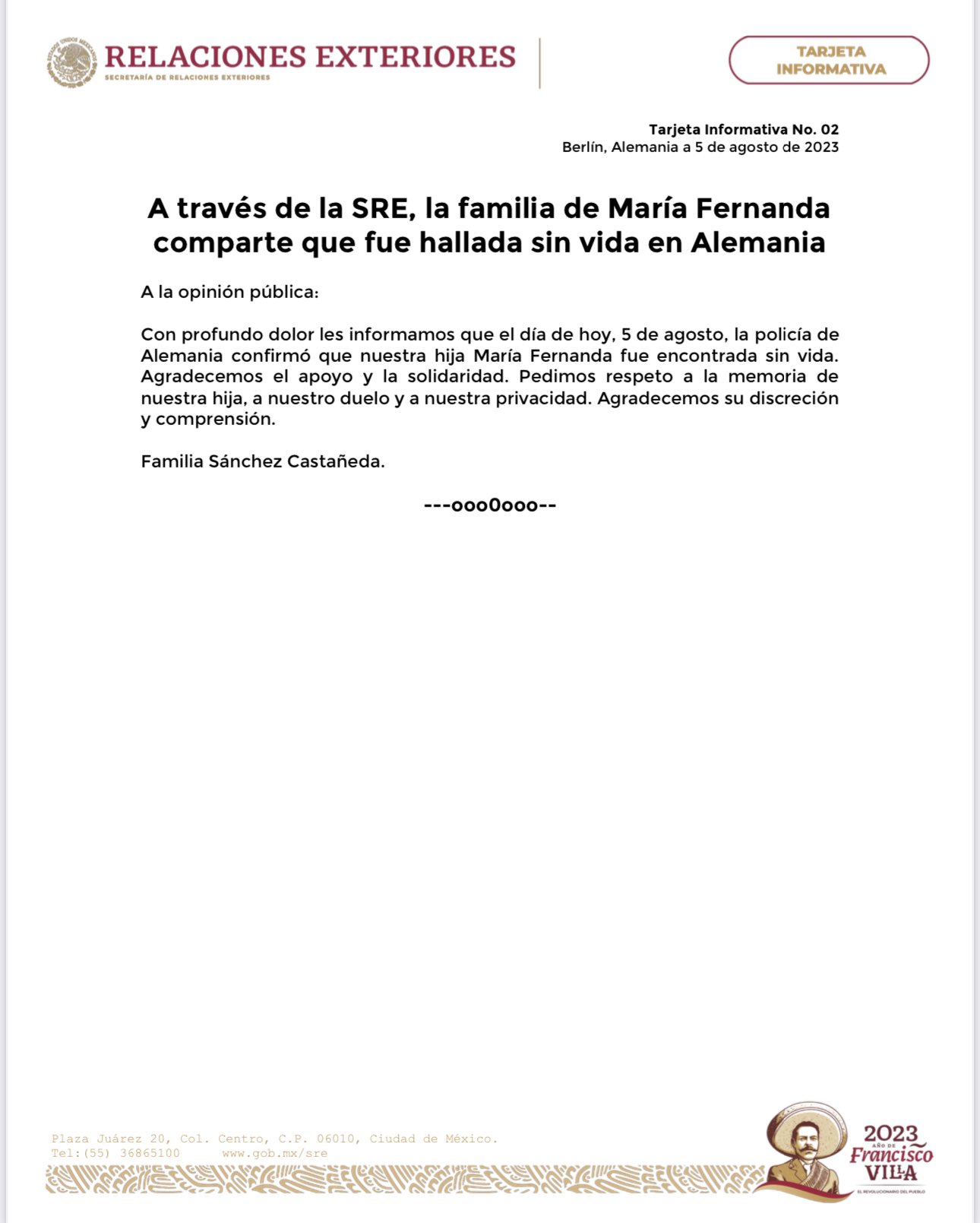 María Fernanda Sánchez Castañeda fue encontrada sin vida en un canal de Berlín el pasado sábado, según confirmó la Policía local. La estudiante de 24 años llevaba dos semanas desaparecida, tras ser vista por última vez en la capital de Alemania.La policía señaló que el cadáver fue encontrado por un transeúnte cerca de un puente en el canal de Teltow, en el distrito de Adlershof. El testigo informó a las autoridades poco antes de las cuatro de la tarde, de acuerdo con la unidad de casos criminales.La policía de Berlín dijo este domingo que una autopsia sería el siguiente paso para determinar las circunstancias de la muerte de María Fernanda Sánchez. Una vocera de la policía declaró: "Se ha abierto una investigación sobre la muerte. La causa de la muerte se aclarará en el curso de una autopsia". Asimismo añadió que es probable que se lleve a cabo en los próximos días.Asimismo, la portavoz repitió la declaración inicial de la policía acerca de que hasta el momento no se había podido establecer ninguna influencia externa en la muerte de la joven de 24 años.El embajador de México en Alemania, Francisco Quiroga, en entrevista con Foro TV, comentó que el cuerpo de la joven no presentó indicios de violencia: "Aunque no hay indicios de violencia, no se descartan ningún escenario y la autopsia nos va a dar mucha luz, martes o miércoles de la próxima semana", afirmó.La familia de María Fernanda ha sido muy reservada sobre el caso, pero el sábado por la noche emitió un comunicado confirmando la muerte y pidiendo respeto a su dolor: MM