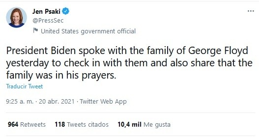 El Presidente de Estados Unidos, Joe Biden, dijo el martes que las pruebas en el juicio sobre la responsabilidad de un ex policía blanco en la muerte del afroestadounidense George Floyd eran "abrumadoras"."Conocí a la familia de George (...). Es una buena familia", agregó, evocando "la angustia" que sufren los familiares a la espera de la decisión del jurado.La portavoz de la Casa Blanca, Jen Psaki, había informado poco antes en Twitter que Biden habló el lunes con los familiares de Floyd."El presidente Biden habló ayer (lunes) con la familia de George Floyd para oír las novedades sobre él y asegurarles que estaba orando por ellos", dijo Psaki.El jurado se retiró el lunes para deliberar sobre la responsabilidad de Derek Chauvin, un ex policía blanco de 45 años enjuiciado por asesinato, homicidio involuntario y violencia intencional que resultó en la muerte de Floyd, a quien había arrestado apoyado por otros agentes por un delito menor.Durante más de nueve minutos, Chauvin mantuvo su rodilla presionando en el cuello del hombre de 46 años, que estaba acostado boca abajo con las manos esposadas a la espalda.Su agonía, filmada en vivo por los transeúntes, generó conmoción internacional y provocó manifestaciones de proporciones históricas contra el racismo y la violencia policial tanto en Estados Unidos como en varios países del mundo.Los hechos ocurrieron el 25 de mayo de 2020 en la ciudad estadounidense de Minneapolis.El juicio se lleva a cabo en medio de altas tensiones y protestas diarias de personas y organizaciones civiles tras la reciente muerte de otro joven negro en las afueras de Minneapolis.GC