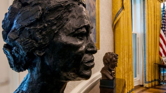 Es común que los nuevos presidentes de Estados Unidos den su toque personal al Despacho Oval de la Casa Blanca a su llegada. Y los cambios que hizo Joe Biden son toda una declaración de intenciones.La oficina del mandatario, en el ala oeste de la Casa Blanca, ha sido decorada con retratos y bustos de algunos de los líderes más icónicos e influyentes de la historia del país."Era importante para el presidente Biden entrar a un Despacho Oval que se pareciera a Estados Unidos y empezara a dar una visión de quién va a ser él como presidente", explicó Ashley Williams, subdirector de operaciones del Despacho Oval, a The Washington Post durante una visita exclusiva.Atrás quedó el retrato de Andrew Jackson, el 7º presidente de Estados Unidos y líder populista con quien Trump frecuentemente se identificaba y cuyo gobierno también enfrentó desaprobación pese a que nunca llegó a ser objeto de un juicio político (impeachment).Su retrato, a la izquierda del asiento del escritorio "Resolute", fue reemplazado con uno de Benjamin Franklin, uno de los padres fundadores de la nación y prominente escritor, científico y filósofo.The Post señaló que el retrato de Franklin tenía como objetivo representar el interés del presidente Biden en confiar en la ciencia en la lucha contra la pandemia de coronavirus.Desde su escritorio, Biden alzará la vista y verá, flanqueando la chimenea, bustos de Martin Luther King y Robert F. Kennedy, dos hombres cuyo impacto en el movimiento por los derechos civiles es mencionado por el mandatario de forma habitual, según la prensa estadounidense.Otros bustos colocados en la habitación incluyen el de la destacada activista Rosa Parks.Encima de la chimenea está colgado un retrato de Franklin D. Roosevelt, el presidente que guió al país durante la Gran Depresión y la Segunda Guerra Mundial.La pintura de otro expresidente, Thomas Jefferson, está acompañada de otra de un hombre con el que comúnmente tenía desacuerdos: el ex secretario del Tesoro Alexander Hamilton, un "símbolo de cómo las diferencias de opinión, expresadas dentro de las barandas de la República, son esenciales para la democracia", señaló la oficina de presidente, según The Post.Los retratos de otros célebres expresidentes, George Washington y Abraham Lincoln, también se colocaron emparejados.Pero si hay un detalle que captó especialmente la atención del público en redes sociales fue el del busto del líder sindicalista hispano César Chávez.El busto de Chávez (1927-1993) se encuentra justo a espaldas del sillón del escritorio de Biden, en una mesa y un lugar privilegiado: entre numerosas fotos familiares.Chávez, oriundo de Arizona, fue fundador del sindicato United Farm Workers y uno de los más importantes líderes latinos en defensa de los derechos civiles de los hispanos y de los trabajadores del campo, en su mayoría inmigrantes.El activista hizo popular el grito de "sí, se puede", creado por su compañera de sindicato Dolores Huerta y que años después adoptaría Barack Obama en su campaña por la presidencia.Otra de las cosas con las que rompió Biden a su llegada fue con las cortinas doradas que colocó Trump cuando asumió el poder en 2017.El dorado ha sido reemplazado por unas cortinas de un tono más oscuro de ese mismo color y de azul, que adornaban esa misma oficina cuando el presidente demócrata Bill Clinton estaba al mando, informa The Washington Post.Las banderas de las diferentes ramas del Ejército también han sido reemplazadas por la bandera estadounidense y otra con el sello presidencial.Biden también decidió deshacerse de un controvertido busto del líder británico Winston Churchill.Trump había prometido devolver ese busto al Despacho Oval después de que fuera retirado por su predecesor, Barack Obama.El entonces ministro de Exteriores Boris Johnson -ahora primer ministro de Reino Unido- acusó entonces a Obama de "tener una aversión ancestral por el imperio británico".En esta ocasión, su portavoz se alejó de la controversia: "El Despacho Oval es la oficina privada del presidente y le corresponde a él decorarla como desee".Ahora puedes recibir notificaciones de BBC Mundo. Descarga la nueva versión de nuestra app y actívalas para no perderte nuestro mejor contenido.JM