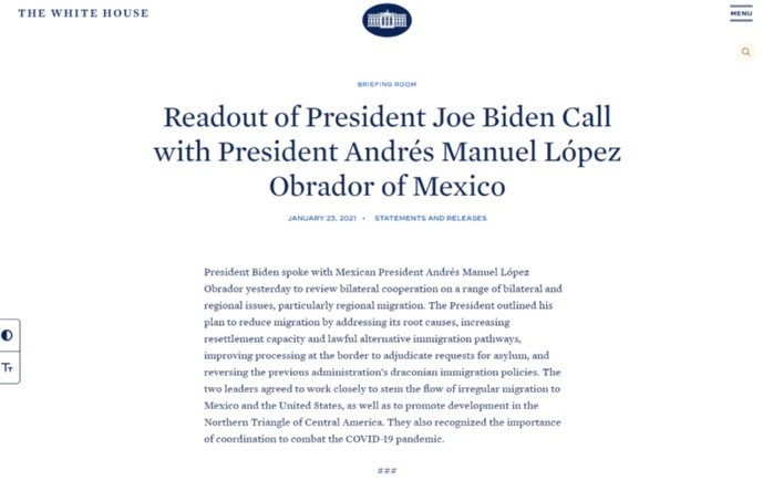 La plática telefónica del viernes entre el Presidente de México, Andrés Manuel López Obrador (AMLO), y el de Estados Unidos, Joe Biden, sirvió para que el nuevo mandatario estadounidense explicara sus planes para las relaciones bilaterales, "particularmente" en el tema de la migración en la región, según informó la Casa Blanca en un comunicado este sábado.En la versión de las autoridades de la Unión Americana, Biden utilizó la llamada para exponer su plan en el ámbito migratorio y todo lo que quiere conseguir con él:Reducir la migración abordando las causas de raíz, incrementar, aumentar la capacidad de reasentamiento y las vías de inmigración alternativas legales, mejorar el procesamiento en la frontera para adjudicar solicitudes de asilo y revertir las "draconianas políticas de inmigración de la administración anterior".En su primer día como presidente, Biden ya firmó una serie de decretos u órdenes ejecutivas sobre migración y la relación bilateral con México, como el fortalecimiento del programa DACA para no deportar a jóvenes indocumentados o el freno de la construcción del muro.Se espera que el próximo viernes firme más directivas sobre el tema, en particular para revertir la política de asilo de la era Trump y volver a acoger refugiados.Está previsto que en pocos días, Biden envíe al Congreso su ambicioso plan de reforma migratoria, que entre sus cláusulas incluye un camino a la ciudadanía para regularizar a más de 11 millones de indocumentados.El Departamento de Seguridad Nacional de EU, por su parte, también ha empezado a trabajar para fulminar políticas polémicas de Trump en temas migratorios, al pausar por cien días la mayoría de las deportaciones y poner en pausa el programa Quédate en México (MPP).Según el comunicado, ambos líderes quedaron de acuerdo en seguir trabajando juntos para "contener el flujo de inmigración irregular" desde México hacia Estados Unidos, así como promover el desarrollo en la región del conocido Triángulo Norte centroamericano (Guatemala, Honduras y Nicaragua).Además del tema migratorio, Biden y AMLO también reconocieron la "importancia" de coordinarse en la lucha contra la pandemia de COVID-19.El comunicado de la Casa Blanca llegó más de 14 horas después del informe de la llamada emitido por la presidencia y la Secretaría de Relaciones Exteriores mexicanas, que calificaron la plática como una charla "amable y respetuosa" en la que se trataron temas de migración, COVID-19 y cooperación para el desarrollo y el bienestar."Todo indica que serán buenas las relaciones por el bien de nuestros pueblos y naciones", resumió entonces AMLO, a través de su cuenta de Twitter.OF