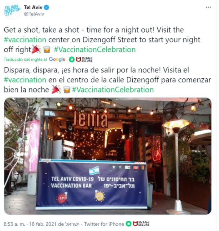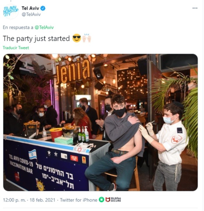 Un bar ubicado en Tel Aviv, Israel, tomó la iniciativa de regalar bebidas a los jóvenes que se vacunen contra el coronavirus (COVID-19) dentro de su local, lo que ha llamado la atención estos últimos días, y que habla de la manera en que se gestiona la pandemia en el país.El país no es uno de los que produzcan vacunas, sin embargo, el gobierno se ha movilizado para asegurar suficientes dosis para sus más de nueve millones de habitantes, tanto con los laboratorios Pfizer y Moderna. Luego de que iniciaran de manera rápida su campaña de vacunación, en Israel se ha vacunado a aproximadamente la mitad de su población, y se pretende tener a prácticamente todos sus adultos vacunados a finales del próximo mes.Como forma de incentivar a la población a seguirse vacunando, el bar ofrece, principalmente a los jóvenes, bebidas gratis, siempre y cuando estas no contengan alcohol, debido a las recomendaciones de médicos.Las autoridades de Israel han aplicado al menos una dosis de las vacunas anti COVID-19 en alrededor del 50% de la población, una de las proporciones más altas del mundo. En el país se han registrado poco más de 760 mil casos de contagio de COVID-19, con cinco mil 634 muertes desde que inicio la pandemia, por lo que es una de las naciones menos afectadas. En el mundo, aproximadamente 2.5 millones de personas han fallecido debido a la enfermedad.OF