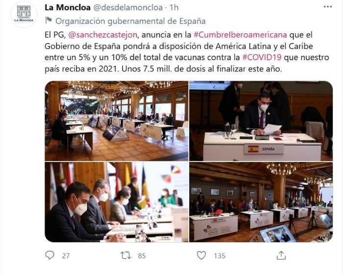 El presidente del gobierno español, Pedro Sánchez, anunció este miércoles que su país donará al menos 7.5 millones de dosis de vacunas anticovid a países latinoamericanos durante 2021, en el marco de la Cumbre Iberoamericana que tiene lugar en Andorra.España "va a poner a disposición de América Latina y el Caribe entre un 5 y un 10% del total de vacunas contra el COVID-19 que nuestro país va a recibir" este año, señaló Sánchez ante el foro político que reúne a 19 países latinoamericanos, junto a España, Portugal y Andorra.Esos porcentajes supondrían "al menos 7.5 millones de dosis al finalizar el presente año", dijo Sánchez, al afirmar que "el acceso a la vacuna debe ser equitativo y universal".Las dosis se empezarán a entregar cuando España llegue "al umbral del 50% de la población vacunada", señaló Sánchez, cuyo gobierno tiene como objetivo tener al 70% de los 47 millones de españoles inmunizados para agosto.El líder socialista explicó que las vacunas serán entregadas a través del Covax, el mecanismo instaurado por la Organización Mundial de la Salud (OMS) para una distribución equitativa de las vacunas.A su vez, será la Organización Panamericana de la Salud (OPS) la que distribuirá "los viales según las necesidades de cada país", apuntó.Al igual que otros países europeos, España ha sufrido retrasos en la llegada de vacunas. Hasta el momento, se ha administrado la pauta completa a 3.6 millones de personas, un 7.6% de la población.Según cifras del ministerio español de Sanidad, el país ha pactado hasta ahora la compra de más de 93 millones de dosis de vacunas, muchas más de las necesarias para vacunar a su población.JM