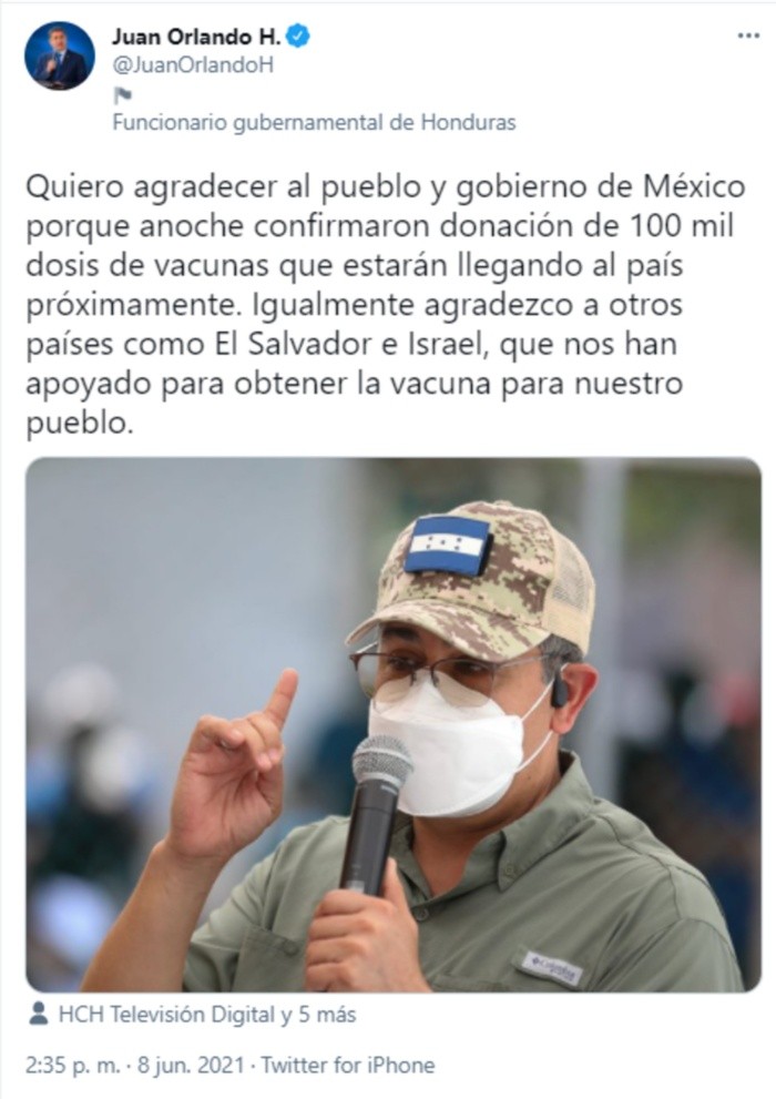 El presidente de Honduras, Juan Orlando Hernández, anunció el martes que su país recibirá una donación de 100 mil vacunas contra el COVID-19 por parte de México y agradeció a El Salvador e Israel por las que han donado para inocular a la población hondureña."Quiero agradecer al pueblo y Gobierno de México porque anoche confirmaron donación de 100 mil dosis de vacunas que estarán llegando al país próximamente. Igualmente agradezco a otros países como El Salvador e Israel, que nos han apoyado para obtener la vacuna para nuestro pueblo", indicó Hernández en Twitter.El gobernante no precisó de qué casa farmacéutica son las vacunas que donará México.En febrero pasado Honduras recibió un lote de cinco mil fármacos de Moderna que donó Israel, con los que se pudieron inocular a dos mil 684 personas, según informaron fuentes médicas.Otro lote de 34 mil vacunas de AstraZeneca fue donado en mayo por El Salvador, para siete municipios hondureños que le solicitaron ayuda en ese sentido.Honduras también recibió este martes por vía terrestre un segundo lote de vacunas AstraZeneca donadas por El Salvador, para municipios de los departamentos de Ocotepeque, en el occidente del país; Choluteca, en el sur, e Islas de la Bahía, en el Caribe.Se trata de 44 mil inoculaciones, de las que las correspondientes a Islas de la Bahía llegarán el jueves por vía aérea, según fuentes oficiales.Hasta ahora, Honduras, país con 9.5 millones de habitantes, ha recibido unas 509 mil 600 vacunas, entre compradas y donadas, de las que en su mayoría han sido aplicadas en su primera dosis. OF