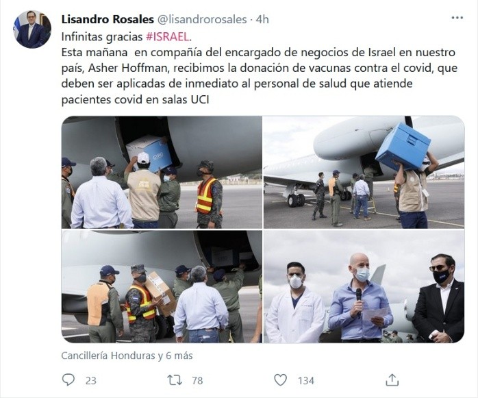 Honduras y Guatemala recibieron el jueves miles de vacunas donadas por el gobierno de Israel. Cada país cuenta ahora con cinco mil dosis iniciales que servirán para empezar a inmunizar al personal de salud.El avión de la Fuerza Aérea Hondureña (FAH), que trasladó desde Tel Aviv el lote de vacunas de la farmacéutica Moderna, arribó a las 10:00 de la mañana hora local a la capital de Honduras en la base aérea "Hernán Acosta Mejía". La aeronave partió de Honduras el pasado domingo hacia Israel y el martes retornó.El canciller Lisando Rosales dijo en conferencia de prensa que "hoy se inicia el proceso de vacunación con esos hombres y mujeres valientes que están en primera línea de atención del COVID-19". Por su parte, la ministra de Salud, Alba Consuelo Flores, aseguró que las primeras dosis serán aplicadas hoy mismo al personal que integrará las cuadrillas que se encargarán de inmunizar a los trabajadores que están en primera línea contra la pandemia, de acuerdo al plan establecido la Secretaría de Salud y el Programa Ampliado de Inmunizaciones (PAI).Las cinco mil vacunas serán aplicadas al personal que corre mayor riesgo y que atienden las UCI, debido a que las mismas no son suficientes para atender a todo el personal en primera línea del país que asciende a unos 28 mil trabajadores.Tras el desaduanaje de las vacunas, las mismas fueron trasladadas a la sede del PAI para su proceso de refrigeración previo a comenzar el proceso de aplicación.Poco después, Guatemala también recibió cinco mil dosis que también fueron donadas por Israel. Las primera inmunizaciones se aplicarán a los trabajadores de salud que atienden a enfermos de COVID.Las vacunas llegaron a bordo de un avión de la Fuerza Aérea desde Honduras y el gobierno dijo que la vacunación iniciará el mismo jueves por la tarde en tres hospitales que reciben a contagiados de coronavirus. Inicialmente se tiene contemplado vacunar a dos mil 500 trabajadores.JM