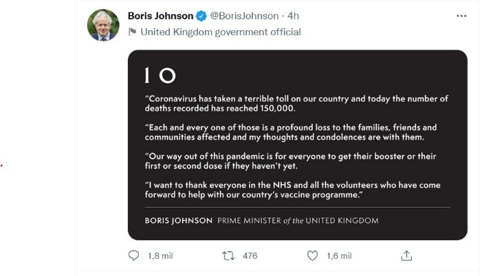 El Reino Unido registró el sábado 313 muertes por COVID-19, con lo cual el balance de decesos en el país -uno de los más enlutados de Europa- se eleva a 150 mil 057 desde el inicio de la pandemia, según datos oficiales.En las últimas 24 horas, se señalaron además 146 mil 390 nuevos contagios de COVID, una cifra en repliegue desde el récord del martes, en momentos en que los hospitales están bajo presión por la variante ómicron del virus, sumamente contagiosa.El primer ministro, Boris Johnson, publicó un mensaje en Twitter, sobre fondo negro, en el que indicaba que "todos y cada uno de los que murieron" a causa del coronavirus suponen "una profunda pérdida para las familias, amigos y comunidades afectadas". "Les llevo en mi pensamiento", expresó.Si bien el número de personas hospitalizadas es por el momento menor (18 mil 454 personas el sábado) al de las anteriores olas de contagios, la presión sobre el sistema de salud sigue siendo muy fuerte.Por el momento, el primer ministro se ha negado a imponer nuevas restricciones con el fin de limitar la propagación del virus -además del trabajo a distancia y del uso de la mascarilla ya existentes-, apostando por la detección y la campaña de vacunación. Esta última ya ha permitido administrar dos dosis al 82% de los mayores de 12 años.JM