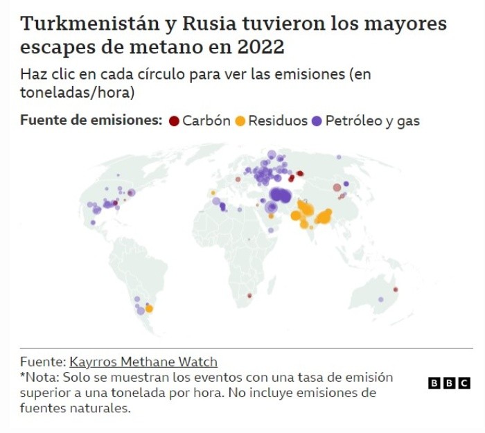 Cuando hablamos sobre el calentamiento global, todos los dedos suelen apuntar a un mismo culpable: el dióxido de carbono (CO2), un gas que producimos cuando quemamos combustibles fósiles como el carbón, el petróleo y el gas.Pero según el Grupo Intergubernamental de Expertos sobre el Cambio Climático -más conocido por sus siglas en inglés, IPCC-, más de un cuarto del llamado "efecto invernadero" es causado por otro gas: el metano (CH4).Quizás has escuchado hablar sobre el problema medioambiental que generan las vacas cuando eructan. Bueno, eso es metano, el principal componente del gas natural, que se produce por la descomposición o putrefacción de la materia orgánica.Aunque lo de las vacas puede sonar un tanto jocoso, lo cierto es que el CH4 preocupa bastante a los expertos porque es un gas muchísimo más dañino para nuestro medio ambiente que el dióxido de carbono.Cuando decimos "muchísimo" no exageramos: según el Programa de las Naciones Unidas para el Medio Ambiente (PNUMA) "el metano es más de 80 veces más potente que el dióxido de carbono en su capacidad de calentamiento durante la docena de años que permanece en la atmósfera".El motivo -explica el organismo- es que "debido a su estructura química, el metano atrapa más calor en la atmósfera por molécula que el dióxido de carbono".Por eso el IPCC señaló que para lograr el objetivo de limitar el calentamiento global a no más de 2Cº en comparación con la era preindustrial, debemos urgentemente reducir en al menos un tercio las emisiones de CH4, una meta a la que se comprometieron 121 países en la Conferencia de Cambio Climático en Glasgow, en 2021.Pero los eructos de las vacas no son el único desafío para lograr esta meta, si bien la ganadería es responsable del 33% de las emisiones de metano producto de actividades humanas.Según el PNUMA, la agricultura y los residuos orgánicos generan otro 30%.Y la mayor fuente de este gas (35%) es la misma que genera la mayoría del dióxido de carbono: los combustibles fósiles.Y una de las maneras que contamina esa industria es a través de los llamados "superemisores" de metano.Los superemisores son equipos, instalaciones u otras infraestructuras que -en general por culpa de fallas- padecen fugas masivas de metano.Estos enormes escapes pueden llegar a durar semanas, liberando gigantes cantidades de CH4 a la atmósfera.Aunque la mayoría de las superemisiones ocurren en la industria del petróleo y el gas, también se pueden producir durante la extracción de carbón y en vertederos muy grandes, como puedes ver en este mapa.Un estudio liderado por el científico Thomas Lauvaux del Laboratorio de Ciencias Ambientales y del Clima de la Universidad de Saclay, en Francia, publicado en 2022 en la revista Science, estimó que entre 2019 y 2020 los superemisores liberaron cerca de 8 millones de toneladas métricas de metano al año durante la producción de petróleo y gas.Eso equivale a entre el 8% y el 12% de las emisiones globales anuales de CH4.Pero, a pesar del enorme daño medioambiental que provocan, hasta ahora ha sido difícil frenar estas grandes pérdidas.Uno de los principales motivos es que para frenarlas primero hay que detectarlas. Y rastrear emisiones de metano es complicado, porque se trata de un gas incoloro e inodoro.Con el fin de hallar y catalogar las pérdidas de metano, el PNUMA lanzó en octubre de 2021 el Observatorio Internacional de Emisiones de Metano (IMEO, por sus siglas en inglés)."El gran desafío es saber exactamente cuánto [metano] se está emitiendo, dónde se está emitiendo y durante cuánto tiempo se ha emitido para así poder reducir las emisiones al nivel que necesitamos", declaró Manfredi Caltagirone, director del IMEO.Giulia Ferrini, quien trabaja en la puesta en marcha del IMEO, señaló a BBC Mundo que para descubrir dónde ocurren las pérdidas "actualmente estamos limitados por imágenes satelitales provenientes del espacio".Estas imágenes son obtenidas por sensores especiales capaces de detectar la presencia de metano.Por ejemplo, los investigadores franceses y estadounidenses que publicaron el estudio sobre superemisores en Science utilizaron información obtenida por el Sentinel-5 Precursor, un satélite de observación terrestre desarrollado por la Agencia Espacial Europea (AEE).El satélite llevó un sensor llamado Tropospheric Monitoring Instrument (más conocido como Tropomi), que logró detectar cerca de 1.800 superemisiones de metano entre 2019 y 2020.Ferrini advierte que el uso de imágenes satelitales tiene sus limitaciones."Es importante reconocer que los satélites pueden ver mejor algunas partes del mundo que otras, por lo que la detección de superemisores puede estar sesgada por la capacidad de observación de los satélites", aclara.No obstante, también afirma que "a medida que la tecnología mejora continuamente, el umbral de observación se reduce significativamente, lo que significa que podemos detectar (y, por lo tanto, mitigar) eventos de emisiones más pequeños. Esto nos equipa para poder progresar más allá de los grandes emisores".El objetivo del IMEO es "integrar datos de múltiples fuentes para, en última instancia, brindar al mundo un conjunto de datos totalmente transparente"."Solo con una sólida comprensión de dónde nos encontramos en términos de emisiones de metano podemos desarrollar un plan claro y sólido de mitigación para proteger nuestro futuro", dice la experta.Ferrini señala que al brindar información de acceso público sobre dónde se producen las grandes pérdidas de metano "las partes interesadas de una variedad de sectores tienen más motivaciones para demostrar sus esfuerzos de mitigación como parte de la lucha global contra el cambio climático".La experta, quien administra la Asociación de Metano de Petróleo y Gas 2.0 del PNUMA, afirma que ese sector, donde ocurre la mayoría de superemisiones, es el que tiene el mayor potencial para arreglarlos "de manera 