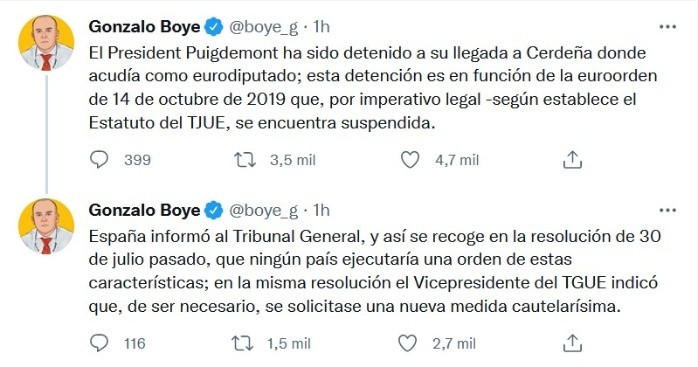 Carles Puigdemont, que fue presidente del gobierno regional catalán durante la declaración fallida de independencia de 2017, fue detenido en la isla italiana de Cerdeña, anunciaron este jueves fuentes de su entorno."El President Puigdemont ha sido detenido a su llegada a Cerdeña, donde acudía como eurodiputado", anunció en Twitter su abogado, Gonzalo Boye, precisando que su detención se produjo en cumplimiento de una orden europea de detención del 14 de octubre de 2019.Puigdemont, actualmente eurodiputado, está establecido en Bruselas desde 2017 y viajó a Alguer, Cerdeña, para un festival cultural catalán, explicó el responsable de su oficina, Josep Lluis Alay."Cuando ha llegado al aeropuerto de Alguer, ha sido retenido por la policía fronteriza italiana", explicó Alay en las redes sociales."Mañana (viernes) el presidente será puesto a disposición de los jueces de la corte de apelación de Sassari, que es competente para decidir su puesta en libertad o su extradición", añadió Alay.Alay explicó que Puigdemont viajó de Bruselas a Alguer para participar en un festival cultural y entrevistarse con las autoridades de la isla.Si te interesó esta noticia y quieres saber más, entonces descarga y descubre INFORMAPlus, la aplicación digital de EL INFORMADOR, en donde tenemos contenidos exclusivos, seleccionados por nuestros editores, para darles una experiencia más completa a los lectores. Si eres suscriptor de EL INFORMADOR tu acceso está incluido, solicítalo al 33 3678-7777.Descarga la aplicación y pruébala GRATIS por treinta días.Para iOS: https://apple.co/35jaVgbPara Android: https://bit.ly/3gwVSEVJM