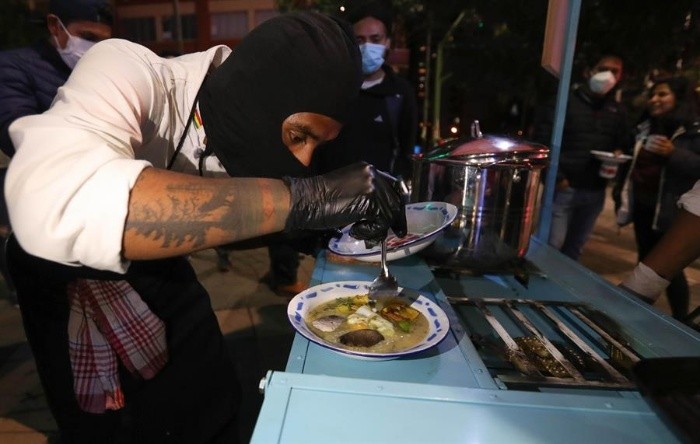 Un pequeño carro móvil celeste es el instrumento de trabajo de cocineros bolivianos que, ataviados con un impecable delantal negro y un pasamontañas que les cubre el rostro, preparan platillos creativos en las calles de La Paz basados en ingredientes nutritivos y locales que están en el olvido.Se trata de los "Carritos clandestinos", una propuesta de comida callejera que ofrece disfrutar de la gastronomía con un toque de creatividad de los cocineros y, a la vez, con valores nutritivos por el uso de los ingredientes.La iniciativa nació luego de que el colectivo gastronómico Sabor Clandestino hiciera unos talleres con los padres de estudiantes de una escuela en El Alto, ciudad vecina de La Paz, para intercambiar ideas sobre nuevas formas de cocinar productos locales.“Ahí ha nacido la idea de poder intentar sacar comida nutritiva, accesible económicamente, en base de productos locales, nuestros, y sobre todo rico y que esté en las calles”, comentó a Efe el coordinador de Sabor Clandestino, el chef Marco Antonio Quelca.Los cinco "carritos clandestinos" que son parte de esta iniciativa se desplazan por La Paz y El Alto en busca de alguna esquina o espacio disponible en las calles para ofrecer una experiencia gastronómica distinta a los transeúntes.El pequeño carro móvil celeste llama la atención porque lleva pancartas con expresiones locales como "uta, que waso", que en este caso se usa para expresar que algo está demasiado bueno, o "la próxima con yapa", en referencia a ese pequeño extra que a veces obsequian los vendedores callejeros de comida a sus compradores.Otro lleva la frase "irreverencia, valor cultural, oído y libre expresión".Los cocineros alistan las ollas, el fuego, los platos y vasos de fierro enlozado de colores y ajustan sus delantales, mientras la gente se acerca curiosa por saber de qué se trata.Por último se colocan el pasamontañas negro y comienzan a explicar el menú a los "caseros", es decir, a los comensales.La idea de taparse la cara es parte del concepto del proyecto con la finalidad de que sus preparaciones "sean la imagen para el comensal" y que los cocineros queden en un segundo plano mientras los "caseros" disfrutan de la experiencia callejera, explicó a Efe el chef Willians Cori.Quelca agregó por su parte que el uso del pasamontañas también tiene un sentido de “irreverencia”, de “clandestinidad” y, a su vez, muestra la “discriminación” que sufren algunos de los oficios más “humildes” en el país que deben ocultar su cara para trabajar, como los lustracalzados.Todos los platillos tienen en común el valor nutritivo y la creatividad en su presentación para hacer de la comida callejera saludable una experiencia sabrosa.Sabor Clandestino creó junto a nutricionistas un recetario con distintas propuestas de desayunos, comidas de media mañana, almuerzos y cenas, la oferta que presentan los carritos a los transeúntes en distintos momentos del día.Los cocineros de los cinco carritos fueron capacitados durante tres meses sobre alimentación saludable y el uso de los ingredientes, contó Quelca.El concepto de estos carritos callejeros es utilizar productos locales como la diversidad de papas nativas, los distintos cereales y alimentos andinos milenarios como la cañahua, la quinua, el amaranto y el tarwi, con nuevas preparaciones para que sean atractivos para los “caseros”.Esta propuesta deja de lado el protagonismo de la carne o las frituras, habituales en los otros carros de comida callejera que abundan en la ciudad, señaló Quelca.Así, Cori instaló su carrito una noche en El Prado, la avenida troncal paceña, para ofrecer unos chorizos hechos con pito de cañahua, que es la harina de ese cereal andino, y otros de acelga acompañados de unos crocantes de chuño o papa deshidratada.También ofrecen pastas hechas de chuño con una salsa de queso, habas y huacataya, una hierba nativa aromática, además de paletas de masa de yuca, queso y plátano y croquetas de quinua, entre otros.Al principio los comensales reaccionan asombrados y algunos un tanto reacios a probar, pero tras el primer bocado preguntan sobre su elaboración y piden más."Generalmente la comida nutritiva es aburrida o desabrida, pero estos cocineros hacen que sea entretenido, bonito a la vista y delicioso", comentó Ángela, una de las comensales.La idea es que el proyecto se expanda y que haya más carritos por la ciudad, pero por ahora el objetivo de Quelca es continuar con los talleres con los padres de familia para que desde la casa se ofrezca a los niños comida con altos valores nutritivos.Incluso existe la posibilidad de que los carritos puedan entrar a las escuelas durante el receso para ofrecer pequeños y baratos refrigerios a los estudiantes.JM