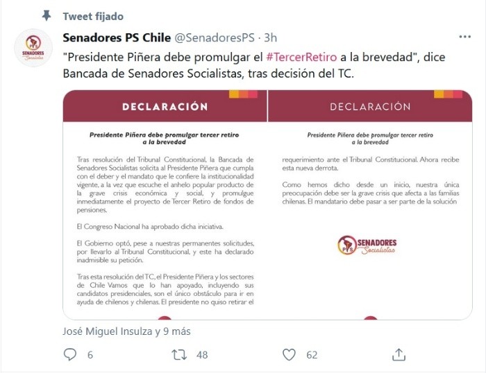 El presidente de Chile, Sebastián Piñera, anunció este martes que promulgará la ley que permite un nuevo retiro del 10 % de los fondos de pensiones, luego de que el Tribunal Constitucional declaró inadmisible la impugnación presentada por el Gobierno contra el proyecto."Como Gobierno, respetamos y aceptamos la decisión del Tribunal Constitucional, sin prejuicio de no compartirla. Por estas razones, promulgaremos hoy la reforma aprobada por el Congreso para permitir los retiros del 10 % de los ahorros previsionales", anunció el mandatario conservador.El nuevo retiro de pensiones, el tercero desde que comenzó la pandemia, fue aprobado la semana pasada por amplia mayoría en el Parlamento -incluso con votos del oficialismo- como una medida para ayudar a la mermada clase media a enfrentar la crisis económica provocada por la pandemia.El Gobierno, bajo el argumento de que la medida hipotecaría las pensiones futuras y dejaría sin fondos a cerca de cinco millones de personas, acudió al Tribunal Constitucional, que este martes falló por siete a tres a favor del nuevo retiro."Estábamos convencidos de que esa reforma podía y debía mejorarse (...) pero en la vida hay que saber aceptar las normas y las decisiones del Estado de Derecho", explicó el mandatario en una rueda de prensa, flanqueado por sus principales ministros.En el Gobierno "no somos indiferentes, no somos ciegos, no somos sordos", agregó para explicar por qué promulgará la ley, al tiempo que descartó cambios en su gabinete y declinó hablar de una "derrota política".JM