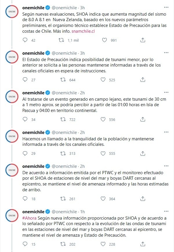 La Oficina Nacional de Emergencias de Chile (Onemi) emitió este jueves una alerta amarilla para el borde costero del país, incluyendo territorio insular, por riesgo de tsunami "menor" tras el terremoto de 8.1 grados Ritcher que tuvo lugar cerca de Nueva Zelanda.El Servicio Hidrográfico y Oceanográfico de la Armada de Chile (SHOA) declaró el "Estado de Precaución" que, según la escala de riesgos que maneja este organismo, "indica la posibilidad de tsunami menor".En director de la Onemi de la región de Tarapacá (norte), Álvaro Hormazábal, informó a través de su cuenta de Twitter que el "Estado de Precaución" declarado por el SHOA significa que las personas que estén en el borde costero tendrá que evacuar."Solamente la gente que esté en la arena, en la playa, tiene que evacuar. No es necesario que la gente se ponga nerviosa y evacúe hacia los puntos de encuentro, eso no tienen que hacerlo, solamente que evacúe las playas", señaló.La cuenta oficial de la Onemi en Twitter informó que, "al tratarse de un evento generado en campo lejano", este tsunami sería de entre "30 centímetros a un metro, aproximadamente", y se podría percibir a partir de las 01:00 de la madrugada hora local de este viernes en Isla de Pascua y 04:00 horas en territorio continental.El Servicio Geológico de Estados Unidos (USGS, en inglés) detectó el movimiento telúrico en Nueva Zelanda, lo que motivó que el Centro de Alertas de Tsunamis del Pacífico (PTWC) emitiera un aviso por maremoto.De acuerdo con el USGS, el terremoto tuvo su epicentro en las islas Kermadec, a mil 033 kilómetros de las costas de Nueva Zelanda, y con 19 kilómetros de profundidad, siendo el tercero de una seguidilla de sismos que sacudieron Oceanía, lo que llevó al país insular a evacuar sus costas por la amenaza de olas de hasta tres metros.Perú lanzó el viernes una alerta de tsunami en su costa, aunque sin orden de evacuar, luego de que un fuerte terremoto sacudiera unas remotas islas de Nueva Zelanda, al otro lado del océano Pacífico."Tras el sismo [...] ocurrido en islas Kermadec (Oceanía), DHN Perú [Dirección de Hidrografía y Navegación] informa que genera alerta de tsunami en el litoral peruano", anunció el Centro de Operaciones de Emergencia Nacional (COEN) en Twitter."Se estima llegada del tren de olas durante la madrugada del 5 de marzo" a la costa peruana, de tres mil kilómetros de longitud desde Ecuador a Chile, agregó.El COEN explicó que una "alerta de tsunami se emite luego de un sismo de gran magnitud para que la población se prepare para evacuar hacia las zonas seguras y elevadas, si así lo determinan las autoridades".JM