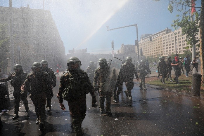 Las calles de Chile han vuelto este miércoles a acoger los reclamos de la ciudadanía en el marco de las protestas iniciadas el pasado 18 de octubre, en una jornada en la que marcharon frente al palacio de La Moneda, sede el Gobierno del país.La protesta comenzó en la céntrica Plaza Italia de Santiago, epicentro del descontento social, protagonizada por gremios sindicales, educativos y docentes, que se desplazaron con el objetivo de poder marchar frente a La Moneda.La idea de manifestarse frente al palacio de Gobierno fue frustrada en las dos jornadas anteriores y acabó en enfrentamientos entre manifestantes y las Fuerzas Especiales de Carabineros en medio de un intercambio de piedras, gases lacrimógenos y balines de goma bajo el humo de los incendios y las barricadas.Sin embargo, la marcha de este miércoles emprendió el camino por la Alameda Bernardo O'Higgins, principal arteria de la capital y llegó hasta La Moneda sin que la Policía les impidiera el acceso a la parte frontal del edificio.La marcha se realizó en el contexto de un llamado a huelga general hecho por la plataforma Unidad Social, que incluye a unas 70 organizaciones sindicales y sociales.A pesar de que la manifestación no tenía permiso de las autoridades, como ninguna de las que han llevado a cabo en los últimos 12 días de protestas, Carabineros no reprimió a los ciudadanos como sí ocurrió en ocasiones anteriores.Una gran parte de los manifestantes eran funcionarios públicos de distintos sectores que mostraron frente a La Moneda sus lienzos y proclamas."Jubilarse para salir a mendigar", "Piñera, muchas hormigas se pueden comer un elefante" fueron algunos de los lemas que se podían leer en los carteles, así como pedidos ya repetidos por su renuncia como mandatario del país austral y, en este caso, la salida de la ministra de Educación, Marcela Cubillos.Banderas de Chile y de la comunidad mapuche volvieron a recorrer, como ya se ha vuelto habitual, el camino de la plaza hasta la sede del Ejecutivo con reclamos que se replicaron en ciudades como la costera Valparaíso.A pesar de lo pacífico de la manifestación, con el paso de las horas y el continuo goteo de ciudadanos que se acumulaban frente a La Moneda, Carabineros desplegó un carro lanza-agua para dispersar a la multitud después de que estuviera cuatro horas frente al edificio de la Presidencia.JM