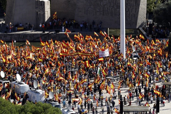 Centenares de personas salieron hoy a las calles de esta capital en defensa de la unidad de España y en contra de la independencia de Cataluña, así como para reclamar la detención del destituido presidente de la disuelta Generalitat catalana, Carles Puigdemont.Convocados por la Fundación para la Defensa de la Nación Española (Denaes), los manifestantes ataviados con banderas españolas y reunidos en la Plaza Colón gritaban consignas como "Viva España" y "Puigdemont a prisión".LEE:Puigdemont pide ''oposición democrática'' contra gobierno españolLos oradores llamaron a mantener la movilización contra el independentismo y demandaron firmeza al presidente del gobierno español Mariano Rajoy al momento de aplicar el artículo 155 de la Constitución, mediante el cual se disolvió la Generalitat y el parlamento catalanes.Rajoy designó a la vicepresidenta Soraya Sáenz de Santamaría a cargo del gobierno de Cataluña y tomó medidas para controlar a la policía local, mientras que Puigdemont desconoció la validez de su destitución y llamó a mantener una "oposición democrática" contra la aplicación del artículo 155.Uno de los oradores, el presidente del partido político VOX España, Santiago Abascal, consideró que la aplicación del artículo 155 de la Constitución y la convocatoria de elecciones anticipadas no es suficiente para solucionar la crisis institucional en Cataluña.Aseveró que no aceptará ninguna solución que no pase por la detención del destituido presidente de la Generalitat y del resto de integrantes de su gobierno.A la manifestación asistieron destacados dirigentes del Partido Popular como la presidenta de la Comunidad de Madrid, Cristina Cifuentes, o el vicesecretario de comunicación de la formación, Pablo Casado.El viernes pasado, el Parlamento catalán declaró de manera unilateral la independencia de Cataluña, por lo que el gobierno español aplicó el artículo 155 de la Constitución, la destitución de Puigdemont, la destitución del Legislativo catalán y convocó a elecciones el 21 de diciembre próximo.