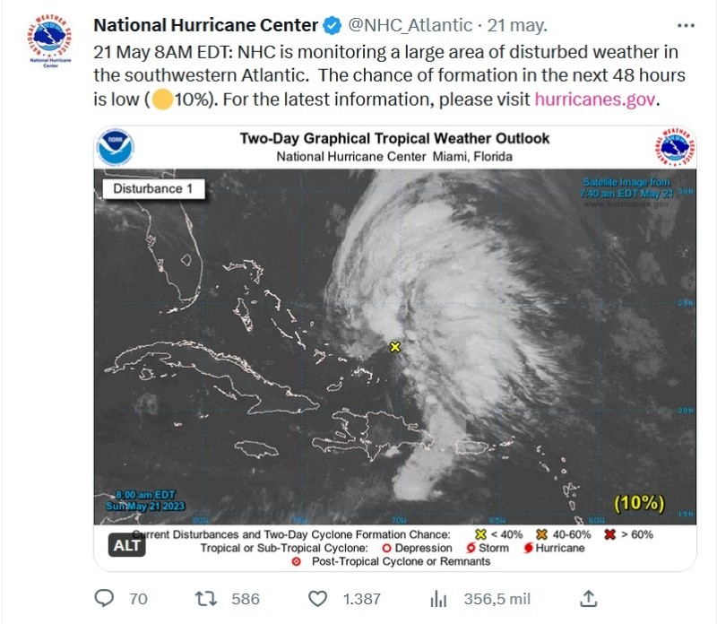El Centro Nacional de Huracanes (NHC) de Estados Unidos está vigilando ese lunes una gran área de baja presión en el Atlántico situada al noreste de las Bahamas, aunque las probabilidades de que se transforme en depresión o tormenta tropical son escasas (10 por ciento).La temporada ciclónica en el Atlántico comienza oficialmente el 1 de junio, pero hace tiempo que a fines de mayo suelen ya presentarse condiciones propicias para la formación de fenómenos tropicales. En 2021 y 2022 no se adelantó la temporada, pero sí en 2019 y 2020, cuando las primeras tormentas con nombre, "Andrea" y "Arthur", respectivamente, se presentaron en mayo.Según un informe publicado este lunes por el NHC, se esperan en el suroeste del Atlántico aguaceros y algunas tormentas eléctricas asociadas con un área amplia de baja presión localizada a varios cientos de kilómetros al noreste del centro de las Bahamas.El organismo con sede en Miami indicó que la presencia de vientos fuertes en los niveles altos y del aire seco prevengan el desarrollo mientras el sistema se mueve generalmente hacia el norte-noreste a una velocidad lenta.Según un pronóstico de la Universidad Estatal de Colorado (CSU) difundido el 13 de abril, la temporada ciclónica 2023 en el Atlántico tendrá una actividad "ligeramente por debajo del promedio", con un total de 13 tormentas con nombre, de las cuales dos se convertirán en huracanes mayores,De acuerdo a las predicciones del Departamento de Ciencias Atmosféricas de CSU, la actividad en la cuenca atlántica se verá influida este año por la previsible aparición del fenómeno meteorológico "El Niño", que suele apaciguar las condiciones que dan pie a la formación de huracanes. JM