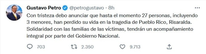 Un derrumbe en Colombia se cobró la vida de al menos 34 personas que se movilizaban en un autobús por una vía del centro-oeste del país, confirmaron el lunes los organismos de socorro tras concluir una búsqueda de más de 24 horas.La Unidad Nacional para la Gestión de Riesgo de Desastres detalló en un comunicado que entre los fallecidos hay ocho menores de edad. Los cuerpos de las víctimas serán trasladados a Pereira, la ciudad principal de Risaralda, para su sepultura y entrega a los familiares.El derrumbe ocurrió el domingo en una vía de esa ciudad e involucró tres vehículos que transitaban por una carretera en la pendiente de una montaña. El más afectado fue el autobús de servicio público con 33 ocupantes —incluido el conductor— que fue arrastrado y quedó sepultado unos dos metros bajo tierra. Además, fueron afectados un automóvil con otros seis pasajeros y una motocicleta con dos personas.Los organismos de socorro lograron rescatar a nueve personas con vida que permanecen en hospitales. Más de 70 personas trabajaron en las labores de rescate apoyadas con retroexcavadoras y vehículos livianos en la vía que comunica a Risaralda con el departamento de Chocó, al oeste del país.El presidente Gustavo Petro lamentó a través de Twitter la emergencia y ofreció a las familias de las víctimas un "acompañamiento integral por parte del gobierno Nacional".El derrumbe se produjo en el municipio de Pueblo Rico, Risaralda, donde ya existía una amenaza de movimiento de masa debido al fenómeno de La Niña que ha aumentado considerablemente las lluvias, lo que habría sido uno de los detonantes de la tragedia, explicó la autoridad de gestión de desastres.El gobierno indicó que trabajarán en la revisión de la vía donde ocurrió el derrumbe y en otros tramos que pueden estar en riesgo para evitar que una emergencia similar se repita, debido a que la temporada de lluvias persiste en todo el país.JM