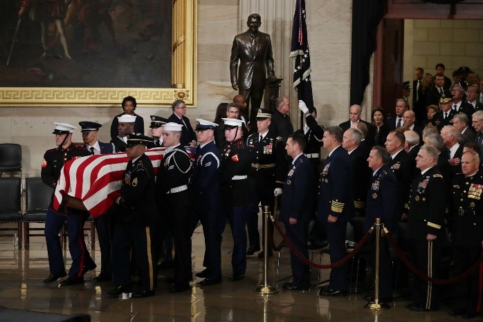 La recepción del féretro con los restos mortales del expresidente de EU George H. W. Bush comenzó hoy en el Capitolio, en Washington, poco después de aterrizar en la base de Andrews, a las afueras de la ciudad, para que el público pueda rendirle tributo.Minutos antes de las 17:00 hora local (22.00 GMT), los restos llegaron al edificio que acoge el Congreso bicameral, donde fue recibido por un comité integrado por los líderes de la Cámara de Representantes y el Senado, tanto del Partido Demócrata como del Republicano, y liderado por su hijo, el expresidente George W. Bush.El avión que transportaba el féretro aterrizó poco antes de las 15:30 horas en la base, donde fue recibido por miembros de las fuerzas aéreas y de las fuerzas especiales.En el Capitolio, el cuerpo del expresidente número 41 de los Estados Unidos será expuesto bajo la cúpula central del edificio y permanecerá accesible para permitir que los ciudadanos ofrezcan sus respetos y sus condolencias.La capilla ardiente abrirá sus puertas al público desde las 19:30 hora local desde este lunes (00.30 GMT del martes) y las cerrará el miércoles a las 07:00 de la mañana (12.00 GMT), puesto que ese mismo día tendrá lugar la ceremonia oficial del funeral de Estado.El oficio contará con la presencia del presidente Donald Trump y la primera dama, Melania, así como otros exmandatarios y personalidades destacadas de la vida pública estadounidense, como miembros del Gobierno y del Tribunal Supremo.Después, el féretro de Bush padre, como se le conocía para diferenciarle de su hijo, será trasladado a Houston de nuevo para recibir un último adiós por parte de su familia.En la mañana del jueves, se celebrará en la ciudad texana un oficio privado en la Iglesia Episcopal de St. Martin, lugar al que él y su mujer, la ex primera dama Barbara Bush, fallecida en abril de este año, acudían con regularidad.Precisamente, los restos de George H.W. Bush descansarán junto "al amor de su vida", como él definía siempre a Barbara Bush, en la Biblioteca Bush situada en la localidad de College Station (Texas), a 160 kilómetros de Houston.El patriarca de la familia Bush fue piloto de guerra durante la Segunda Guerra Mundial, congresista, embajador en la ONU, director de la CIA, vicepresidente en la Administración de Ronald Reagan entre 1981 y 1989 y puso fin a sus cuatro décadas de carrera política como presidente (1989-1993), desde donde lideró el fin de la Guerra Fría.JB