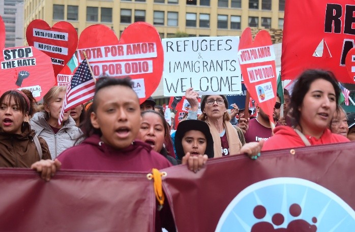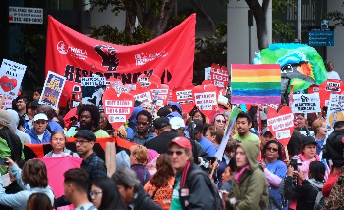 Con un gigantesco mensaje de "Resiste", miles de manifestantes tomaron las calles del centro de Los Ángeles para exigir fin al odio, a las deportaciones y respeto a los derechos laborales.Decenas de organizaciones convocaron a la marcha que esta vez fue afectada por un día nublado y llovizna a ratos, pero que no mermó el ánimo de muchos que bailaron y lanzaron consignas."El presidente Donald Trump solo ha avivado el odio, el rencor y la división entre los estadunidenses, y le demandamos que ya basta de perseguir a los inmigrantes", urgió por su parte Roberto Muñoz."Trump con sus ataques solo crea división en este país y no debemos caer en esa trampa. Debemos resistir y lo vamos a lograr, vamos a seguir adelante", señaló María Elena Durazo, de la Federación de Trabajadores de Los Ángeles."Todos los días ocurren violaciones de derechos humanos, laborales y civiles de los inmigrantes en este país, y por eso demandamos un alto a esta represión", afirmó por su lado Angélica Salas, directora de CHIRLA."En la frontera tenemos a decenas de familias que caminan por más de un mes y piden ayuda y protección a sus vidas, y ni a eso responde este gobierno", añadió la dirigente de la Coalición por los Derechos Humanos de Inmigrantes (CHIRLA)."Las elecciones tienen consecuencias, y las consecuencias para nuestra comunidad han sido terribles, y si no cambiamos el equilibrio de poder, cuestionamos nuestra capacidad de permanecer libres en este país", advirtió Salas.En lo que ha sido una constante ya de años en la demanda se urgió una reforma migratoria, aunque ya esta consigna ha pasado a segundo término porque ahora prevaleció más la exigencia del alto al odio y a las deportaciones.Este día al menos tres marchas iniciaron en distintos puntos del centro de la ciudad, lo que causó un gigantesco caos vehicular en esta de por sí congestionada ciudad.El 1 de mayo, también conocido como el Día Internacional de los Trabajadores, ha sido durante mucho tiempo un evento clave en Los Ángeles para una protesta de causas políticas, especialmente los derechos de los trabajadores y los inmigrantes, y ha atraído a miles de personas en años pasados.El martes, justo antes del mediodía, la multitud de docenas de personas que se habían reunido para una marcha por el centro organizado por la Coalición Primero de Mayo, era más pequeña que en años anteriores, dijeron los asistentes.El martes se planificaron varias marchas en todo Los Ángeles y se esperaba que atrajeran multitudes de activistas por los derechos de inmigrantes, sindicatos y defensoras de las mujeres y miembros de la minoría lésbico-gay-bisexual-transexual-intersexual y queer (LGBTIQ).Los funcionarios de transporte comenzaron a cerrar las calles del centro a las 05:00 horas locales, y los funcionarios de la ciudad advirtieron a los viajeros que anticiparan retrasos y congestión en torno a los eventos.La coalición de sindicatos y defensores de los derechos de los inmigrantes planeaban marchar desde Pershing Square hasta Main Street, y luego hasta Temple Street hasta el Roybal Center muy cerca de las cortes de migracion.Otra multitud estaba lista para reunirse cerca de Temple Street y Grand Avenue alrededor de las 09:00 horas antes de marchar hacia el este en First Street y unirse al primer grupo en el Roybal Center.Una tercera marcha comenzó en el Olympic Boulevard y Broadway. Esos manifestantes marcharon por Broadway hasta First Street, al este, hasta Main Street y luego al norte hasta Olvera Street.Los activistas con la Coalición Answer dijeron que los mítines de este año marcarán una "ocasión para continuar la lucha contra la agenda de extrema derecha de la administración Trump".Entre los manifestantes estaba Sofía Camacho, quien con una bandera mexicana en la espalda decía que participaba por el orgullo de ser hija de padres mexicanos y que acudía en su nombre en la marcha para decirle al presidente Trump que no los derrotarán a pesar de sus mensajes de odio y de intimidación. SA