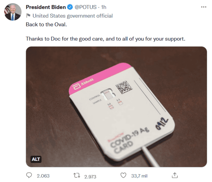 El presidente de Estados Unidos, Joe Biden dio negativo a dos prueba de COVID-19, realizadas el martes y hoy miércoles, por lo que saldrá de su aislamiento, informó la Casa Blanca."De regreso a la Oficina Oval", tuiteó Biden luego que la Casa Blanca difundió el parte más reciente de su médico, confirmando que el mandatario estadounidense ya puede poner fin al aislamiento requerido para todo el que da positivo al virus. Biden, de 79 años, tiene en la agenda un evento en el Rosedal de la Casa Blanca el miércoles al mediodía.Biden terminó su tratamiento con el antiviral Paxlovid y ya no tiene fiebre, dijo el miércoles su médico, el doctor Kevin O'Connor. Añadió que no ha tomado Tylenol en las últimas 36 horas.Ante esas circunstancias y las dos pruebas negativas, añadió el médico, Biden ahora pondrá fin a su "aislamiento estricto".Biden dio positivo al COVID-19 el 21 de julio. Siguió trabajando de manera remota, liderando reuniones virtuales y ofreciendo discursos grabados.GC