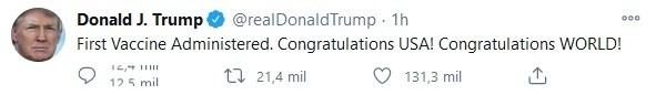 Donald Trump, presidente de los Estados Unidos (EU), anunció este lunes que ya han comenzado a administrarse las primeras vacunas contra el coronavirus COVID-19, fabricadas por la farmacéutica estadounidense Pfizer y su socio alemán BioNTech"Las primas vacunas han sido administradas. ¡Felicidades EU! ¡Felicidades al mundo!", manifestó el mandatario en Twitter.El inicio de la campaña de vacunación sirve para abrir un nuevo capítulo en la batalla contra el coronavirus en EU, donde casi 300 mil personas han perdido la vida y más de 16 millones se han contagiado del virus, más que ningún otro país del mundo en términos absolutos.La vacunación comenzó después de que el viernes por la noche la Administración de Alimentos y Medicamentos (FDA, en inglés), el ente que regula la comercialización de fármacos en EU, aprobara la vacuna después de un riguroso examen para evaluar sus riegos y beneficios.El domingo, aviones y camiones refrigerados comenzaron a distribuir las vacunas a los cientos de puntos de vacunación establecidos por todo el país como parte de la operación Warp Speed (Máxima Velocidad), lanzada por la Casa Blanca con la ayuda del Pentágono para facilitar una distribución lo más rápida posible.Según el general Gustave Perna, encargado de la operación logística de distribución de la vacuna, 145 puntos del país (muchos de ellos hospitales) recibirán la vacuna hoy lunes, mientras que 425 lo harán el martes y 66 el miércoles.En total, durante esta semana, el gobierno enviará a los 50 estados de EU y sus territorios 2.9 millones de dosis.Quienes sean inmunizados tendrán ya reservadas otras 2.9 millones de dosis para poder recibirlas dentro de 21 días, ya que la vacuna tiene que ser aplicada dos veces para ser eficaz.La vacuna tiene una efectividad del 95% cuando se administran esas dos dosis y, además, debe conservarse a temperaturas muy frías, entre -60 y -80 grados centígrados.Se espera que las primeras personas en recibir la vacuna serán los sanitarios y quienes trabajen o vivan en instalaciones dedicadas al cuidado médico a largo plazo, como las residencias de ancianos o los centros para personas con discapacidad, según establecieron los Centros para el Control y Prevención de Enfermedades (CDC, en inglés) en sus recomendaciones.La vacuna de Pfizer llega en el peor momento de la pandemia para Estados Unidos, que promedia más de 200 mil infecciones diarias y que la semana pasada rompió la barrera de las tres mil muertes en un lapso de 24 horas. OA