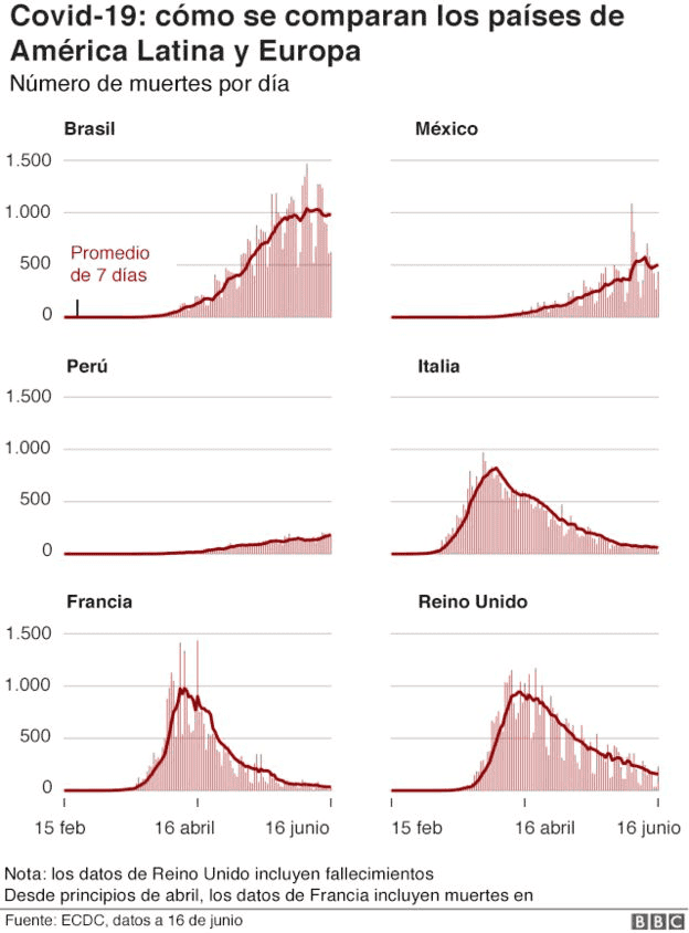 Separada por miles de kilómetros de distancia del foco original en China y con un océano de por medio con el entonces vapuleado sur de Europa, América Latina disponía de algunas ventajas para gestionar la pandemia del nuevo coronavirus.La región registró oficialmente su primer caso el 26 de febrero y, un mes más tarde, cuando Italia ya superaba los 60.000 contagios y los 6.000 muertos, el país latinoamericano más golpeado era Brasil, con apenas 25 fallecidos.Ese mes, casi al mismo tiempo que lo hacía España, varios gobiernos de la región como los de Perú, El Salvador, Panamá, Argentina, Chile, Colombia y Venezuela, entre otros, empezaron a aplicar fuertes medidas de distanciamiento social y de restricción de la movilidad de los ciudadanos para evitar los contagios.Tres meses más tarde, sin embargo, cuando los países en Europa están levantando las limitaciones y comienzan a entrar en la nueva "normalidad", la mayor parte de los países de América Latina no solo están lejos de poder hacer lo mismo sino que se han convertido en el nuevo epicentro de la pandemia.Entre los 15 países del mundo con mayor número de casos confirmados hay cuatro latinoamericanos: Brasil, Perú, Chile y México, de acuerdo con cifras de la Universidad John Hopkins de EE.UU. actualizadas al 17 de junio.El incremento de nuevos contagios, de hecho, llevó a que durante los últimos días los gobiernos de Chile, Perú y Ecuador a extender nuevamente sus medidas de confinamiento.Estados como Paraguay, Uruguay y Costa Rica, que registran un número bajo de contagios confirmados y no llegan a la treintena de muertos, son excepciones a la tendencia general de la región que apunta al alza y aún está lejos del aplanamiento de la curva.¿Qué ha pasado? BBC Mundo te cuenta 5 factores que han puesto a América Latina en el centro de la pandemia de covid 19.La mayor parte de los gobiernos de América Latina fueron diligentes en la aplicación de confinamientos forzosos para evitar la propagación del virus.Sin embargo, para que estas medidas resulten plenamente eficaces deben usarse en el momento adecuado."Si en un país no están circulando casos de coronavirus no tiene sentido aislarme porque no voy a lograr nada. Y, al contrario, si espero hasta tener muchos casos circulando en las calles, costará mucho más trabajo contener la propagación cuando ya está disperso", señala Carlos Arturo Álvarez, médico infectólogo y profesor de la Universidad Nacional de Colombia, a BBC Mundo.El experto afirma que hubo países como Brasil y México que tomaron estas medidas de forma tardía pero que también hubo otros que las quisieron aplicar al mismo tiempo que en Europa, cuando en la región apenas la situación estaba en etapa incipiente."Y ahora vuelve a pasar pero al contrario. Se quiere hacer el desconfinamiento como se está haciendo en Europa pensando que estamos en otra etapa de la pandemia y no es así", apunta.Álvarez subraya que el confinamiento sirvió para reducir el número de contagios en algunos países como Colombia pero que en la medida en la que comienza a levantarse también se produce un aumento de los casos.Jarbas Barbosa, subdirector de la Organización Panamericana de la Salud, valora positivamente estas acciones preventivas aplicadas en la región, pues considera que durante muchas semanas fueron útiles para evitar que hubiera una explosión de casos como ocurrió en Italia o en Nueva York."Estas medidas fueron importantes para evitar la sobrecarga de los servicios de salud y que tuviéramos defunciones por falta de acceso a unidades de terapia intensiva y a ventiladores", dijo en una rueda de prensa en respuesta a una consulta de BBC Mundo.La fuerza con la que irrumpió el coronavirus en Europa -principalmente en Italia y España- generó un fuerte temor entre muchos latinoamericanos que residían en el Viejo continente, quienes optaron por regresar masivamente a sus países de origen y, en algunos casos, trajeron el virus con ellos."Durante la crisis en Europa, muchos peruanos que estudian y trabajan allá regresaron al país, así como lo hicieron después desde Estados Unidos. Allí recibimos la primera ola importante de infectados", explica Eduardo Gatuzzo, profesor emérito de la Universidad Cayetano Heredia de Lima y ex director del Instituto de Medicina Tropical de esa institución.El especialista afirma que en el caso del coronavirus, las evaluaciones en los aeropuertos no son eficaces pues hay muchos infectados que son asintomáticos pero pueden transmitir el virus."Estas personas se reunían con sus familiares y amigos, lo que creó una primera ola de contagios y desde allí pasó a las comunidades", agrega.Gatuzzo señala que luego, con las medidas de cierre de la economía, también se daría un desplazamiento masivo de personas hacia otras zonas del país, donde hubo gran mortalidad.Aunque muchos gobiernos latinoamericanos utilizaron los confinamientos para ganar tiempo y tratar de poner a punto sus sistemas de salud -en muchos casos pobremente dotados- se trataba de un objetivo cuesta arriba."Hay países que han fortalecido su capacidad hospitalaria y diagnóstica, otros no han podido adaptarse a la velocidad a la que está creciendo el virus. Eso puede suceder en Brasil o México, que creo que no están haciendo la cantidad de pruebas que se esperaría", señala Álvarez."En Colombia también ha habido demoras en hacer ampliación de las pruebas de diagnóstico. El problema es que para hacer pruebas moleculares necesitas una infraestructura y el rezago de varios años no se puede superar en unos meses", agrega.Gatuzzo, por su parte, indica que a la limitación de que en Perú no tenían gran cantidad de pruebas moleculares se sumaba el hecho de que solamente había un laboratorio que podía realizarlas."Eso ya lo habíamos criticado cuando la pandemia de H1N1. Teníamos un laboratorio, con pocas pruebas, lo que creó una gran dificultad para diagnosticar la enfermed