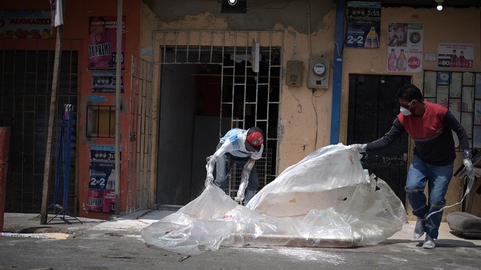 "Primero murió mi hermana. La sacamos de adentro del cuarto porque se ahogaba y la sentamos afuerita de la casa de ella y ahí falleció, en los brazos de nosotros. La llevamos al dispensario, pero llegó muerta.Mi cuñado vio cómo estaba ella y ahí le dio un infarto, porque él también estaba así, delicadito. Yo digo que el mismo impacto fue.En el dispensario nos dijeron que teníamos que llevarnos los cuerpos y tenerlos en la casa para llamar al 911. Entonces los trajimos, los pusimos ahí en la casa y estuvimos llama y llama. Pero no venían.Entonces los embalamos en plástico. Los embalamos como se embala un muñeco. Todo el mundo nos veía como bichos raros, pero estábamos muy asustados porque el ambiente se estaba contaminando".Bertha Salinas me cuenta su historia, por teléfono, desde Guayaquil. Nos separa una cordillera y una cuarentena. En pocas horas conoceré su rostro.Ahora solo tengo frente a mí la foto de los cuerpos embalados de sus familiares. Están en el piso de una casa y parecen momias. A mí me recuerdan a las arañas cuando envuelven a sus víctimas en su fina seda.La ciudad de Guayaquil y la provincia donde se encuentra, Guayas, son las zonas más afectadas por la pandemia de covid-19 en Ecuador.Según las cifras oficiales, publicadas mientras conversaba con Bertha, Guayas tenía más de 2,400 infectados, de los cuales 1,640 habían ocurrido en la capital provincial.El 2 de abril, sin embargo, el presidente Lenín Moreno llamó a transparentar el número de víctimas debido a la gran cantidad de gente que ha muerto por el virus pero no figuran en las listas porque no se les hizo un test.Bertha no es de Guayaquil, llegó allí con toda su familia cuando tenía 14 años."Yo nací en Santa Elena, en Manglar Alto. Mis padres se vinieron a vivir a Guayaquil y nos trajeron a nosotros pequeños. Éramos 10 hermanos, yo la antepenúltima.De todos ellos nos quedamos aquí en Mapasingue mi hermana, la que falleció, y yo; ella tenía 67 años y representaba como una mamá para mí. Se llamaba Inés Salinas.Yo soy casada y tengo cuatro hijos. Ella tenía cinco. A las dos nos dieron nietos. Vivíamos casi en frente y nos veíamos todos los días.Hasta antes de la cuarentena todos estábamos bien.Cuando comenzó la cuarentena ya nos quedamos en la casa, y como por una semana no veía que salía le pregunté a mi sobrina, y ella me dijo: "Mi mamá se siente un poquito delicada".Pero después yo la fui a mirar y estaba bien. Me dijo: "No ñaña, estuve un poquito delicada pero ya me estoy recuperando". Cuando de repente, a los dos días, otra vez recayó y mi sobrina me dijo "tía, mi mami está mala, anoche no podía respirar".Yo me fui a verla a la casa y ella me dijo "ñaña yo me siento mal, me agito mucho, no alcanzo la respiración".Y ya mi cuñado se puso delicadito, también no alcanzaba como a respirar y movía muy fuerte su barriga.Le dije "ñaño, ¿qué te pasa?". "No sé ñaña, yo creo que también me voy a morir".Bertha me cuenta todo esto desde Mapasingue Este, norte de Guayaquil, hacia donde se dirige un fotógrafo contratado por la BBC para tomarle una foto.En el relato, su voz es serena y cuando tiene dudas, alguien que está con ella le sirve como de ayuda memoria.Así me entero de que la familia se comunicó al número 171, designado por el gobierno ecuatoriano para las personas que presenten síntomas, pero se les recomendó quedarse en casa.Aunque buscaron a un médico particular, nadie quiso atenderlos porque los síntomas indicaban que se trataba de covid-19."Ellos decían que esperáramos, que está muy colapsado. Decían "ustedes nomás no tienen este problema, todo Guayaquil está con este problema, por favor esperen" y así nos tenían.Y mi hermana no quería ir al hospital porque veía en las noticias cómo estaban los hospitales."No quiero que me lleven porque dicen que allá están dejando morir la gente, que lo meten al hospital y ya nadie sabe de uno. Yo por eso no quiero ir", me decía.Incluso en esos días una nuera mía llevó a su tía al hospital y asimismo la metieron y no supieron más de ella. Como a los cinco días le dieron la noticia que ya estaba muerta. También por eso los hijos no quisieron dejarla en un hospital.Entonces le dábamos paracetamol, como decían, y le dábamos las agüitas de hierba luisa y agüita de jengibre. También le hacíamos vapores de eucalipto.Yo le dije que si no alcanzaba a respirar tenía que ir al hospital, pero ella dijo: "Si tengo que morirme, moriré aquí en mi casa".Ella y su esposo murieron el lunes 30 de marzo, como a las dos de la tarde. Ella lo conoció nomás de unos 14 años. Él se llamaba Filadelfio Ascencio".Aquí es la primera vez que la voz de Bertha se quiebra, como si la angustiara, y la asombrara por igual, el hecho de que dos personas que se conocían desde hace tanto tiempo pudieran morir casi a la misma hora.Además de la crisis de salud, con hospitales colmados y unidades de cuidado intensivo colapsadas, Guayaquil enfrenta una crisis en la recuperación de los cuerpos porque la mayoría de las empresas funerarias cerraron sus puertas por miedo al contagio, sin discriminar quien había muerto por el virus de quien había fallecido por otras causas.En un primer momento se habló de cavar una fosa común, pero la idea no prosperó. El gobierno nacional debió crear una fuerza de tareas para recuperar los cadáveres y se comprometió a tumbas individuales.La fuerza de tareas involucra al Ministerio de Salud, la policía nacional y las fuerzas armadas, pero incluso estos tres organismos combinados han tenido problemas para lidiar con la Muerte en una ciudad de más de dos millones y medio de habitantes.Los cuerpos de Inés y de Filadelfio permanecieron más de cuatro días en la casa y la familia Salinas, como otras en Guayaquil, recurrieron a las redes sociales. Allí fue donde yo me encontré con la foto de los cuerpos embalados."Recién el jueves vinieron, como a las nueve de 