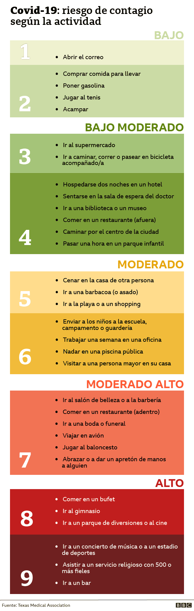 En medio de la actual pandemia de covid-19, seguramente muchos se preguntan cuáles son los riesgos de infección haciendo este tipo de actividades.Preguntas así quería responder la Asociación Médica de Texas (TMA, por sus siglas en inglés), que juntó un panel de 14 expertos en salud pública, epidemiología y enfermedades infecciosas para diseñar una clasificación según el riesgo que supone hacer distintas acciones cotidianas.Ir al gimnasio, comer en un buffet o asistir a un concierto multitudinario están entre las más arriesgadas, según la TMA."Es un gráfico hecho para Texas (EE.UU.), pero sirve para otros países. Hay que considerar las diferencias de cada lugar, pero también hay muchas semejanzas", dice a BBC Mundo el médico John Carlo, experto en salud pública y uno de los miembros de TMA que participó en la creación del gráfico.¿Cómo se hizo el ranking?La clasificación del 1 (menos arriesgada) al 10 (más arriesgada) sigue los siguientes criterios: si las actividades son realizadas en el interior o en el exterior; la proximidad con otras personas; el tiempo de exposición al virus; la posibilidad de seguir las prácticas de prevención (como el uso de mascarillas) y el riesgo de que una persona se contamine realizando la acción.Por eso dos actividades muy distintas pueden ocupar la misma categoría."El centro comercial, a pesar que suele ser un espacio cerrado, puede ser amplio, estar ventilado y puede permitir mantener la distancia social. En cambio, la playa, aunque es un espacio abierto, puede estar abarrotada", dice John Carlo.Para todas las actividades de la lista, los médicos consideraron que los participantes usaban mascarillas, mantenían una distancia de al menos dos metros entre personas (que no fueran sus familiares) y se lavaban las manos siempre que fuera posible."Este es el punto de vista de un grupo de médicos que tenían que responder como estas actividades se comparan en términos de riesgo. Pero solamente la propia persona puede saber las condiciones en que va a practicar la actividad y determinar el riesgo total", añade Carlo.El experto también recalca que el mismo tipo de negocio puede variar mucho, como en el caso de las peluquerías y/o barberías."En Estado Unidos tenemos salones en que hay una persona atendiendo a un solo un cliente. Todo está muy limpio y las dos personas pueden usar mascarillas. Hay otras que no y el riesgo es distinto. Se trata de usar el sentido común para analizar el escenario de cada actividad. Nuestro gráfico es una buena guía, pero la gente tiene que analizar sus propios casos.", concluye Carlo.Recuerda que puedes recibir notificaciones de BBC Mundo. Descarga nuestra app y actívalas para no perderte nuestro mejor contenido.¿Ya conoces nuestro canal de YouTube? ¡Suscríbete!