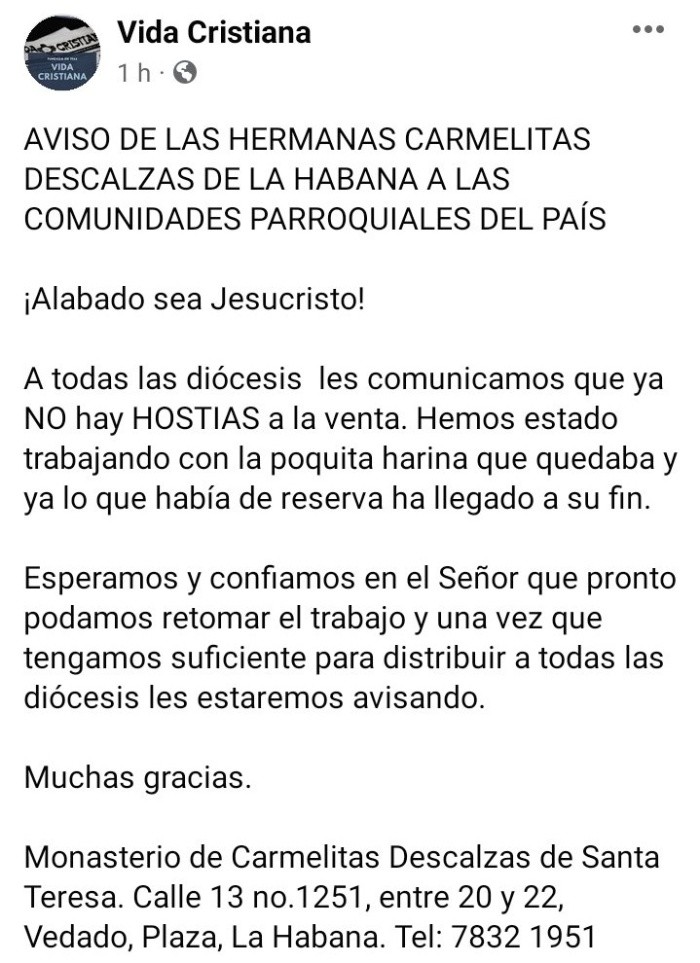 La congregación religiosa católica de las Carmelitas Descalzas anunció este miércoles que no pueden producir hostias para las diócesis del país por falta de harina, un déficit que aqueja desde hace meses a toda la isla."A todas las diócesis, les comunicamos que ya no hay hostias a la venta. Hemos estado trabajando con la poquita harina que quedó y ya lo que había de reserva ha llegado a su fin", escribieron las Carmelitas Descalzas en sus redes sociales.La congregación confió en poder "retomar el trabajo" en breve y tener suficiente cantidad de hostias como para "distribuir a todas las diócesis" del país. Las religiosas no explicaron cómo lo lograrían.La religión católica -incluyendo sus versiones sincréticas- es la mayoritaria en Cuba, pese a que se restringió su práctica a partir del triunfo de la revolución en 1959 . Las limitaciones se han ido suavizando a lo largo de las décadas.Los problemas de abastecimiento de harina son habituales desde hace algunos meses en Cuba . Las panaderías -incluso las estatales- no tienen un suministro regular y algunos establecimientos particulares están días enteros sin poner pan a la venta. Esto genera grandes colas y una espiral de precios.La escasez de productos básicos, de alimentos a combustible y medicamentos, es uno de los aspectos más relevantes y problemáticos de la crisis multifacética que sufre Cuba desde hace dos años.JM