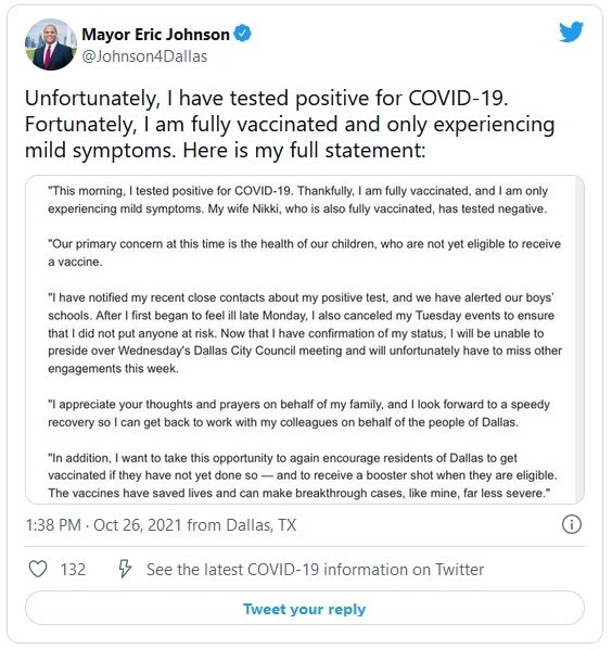 El alcalde de Dallas, Eric Johnson, informó el martes que dio positivo al COVID-19 y que tenía síntomas leves, aunque está completamente vacunado contra la enfermedad.Johnson señaló en un comunicado que se sometió a una prueba diagnóstica después de que empezó a sentirse enfermo el lunes y canceló las actividades que tenía programadas el martes.Añadió que su esposa, Nikki, quien también está completamente vacunada contra el COVID-19, dio negativo al virus.Johnson dijo que había cancelado sus compromisos del resto de la semana. También señaló que había notificado a las personas con las que tuvo contacto recientemente y a la escuela a la que asisten sus hijos, quienes no son elegibles para la vacuna."Agradezco sus pensamientos y oraciones en nombre de mi familia, y espero tener una rápida recuperación para que pueda volver a trabajar con mis colegas al servicio de la gente de Dallas", dijo Johnson."Además, quiero aprovechar esta oportunidad para volver a alentar a los residentes de Dallas a que se vacunen si aún no lo han hecho, y que reciban la dosis de refuerzo cuando sean elegibles. Las vacunas han salvado vidas y pueden hacer que las infecciones posvacuna, como la mía, sean mucho menos graves".JM
