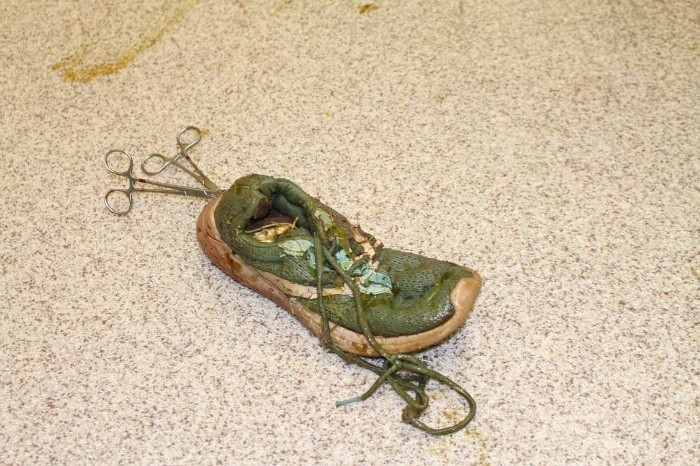 Una enorme hembra de cocodrilo del Nilo de un centro zoológico de San Agustín (Florida) tuvo que ser operada para sacarle del estómago una zapatilla de un visitante que cayó a su hábitat cuando su dueño pasó por encima en tirolesa.Anuket, de 3.2 metros de largo y 154 kilos de peso, se recupera de la intervención realizada en la Facultad de Veterinaria de la Universidad de Florida en el Alligator Farm Zoological Park.Si vuelve a caerle del cielo otro zapato, Anuket seguramente no se lo llevará a las fauces, pues no son los cocodrilos los animales que tropiezan dos veces con una misma piedra.El reptil fue visto con el zapato en la boca en diciembre. Lo tragó y lo regurgitó varias veces hasta que se alojó en su estómago, según un comunicado de la Escuela de Veterinaria que le salvó la vida.En el zoológico trataron de que lo expulsara de forma natural pero no tuvieron éxito, así que Anuket acabó en el hospital de la Escuela de Veterinaria.El residente del hospital veterinario, Garrett Fraess, trató de sacar la zapatilla del estómago a través del esófago metiéndole un brazo en la boca, obviamente después de que Anuket estuviera bien sedada.No lo logró, pues su brazo no era lo suficientemente largo para esta clase de animal, así que hubo que llevarla al quirófano.Allí el cirujano de grandes animales, Adam Biedrzycki, trató de empujar el zapato hacia el esófago a través de una incisión y tampoco sirvió de nada.Anuket acabó sometida a una operación de estómago en la que finalmente le sacaron la zapatilla, que, según las fotografías, quedó inservible.La hembra de cocodrilo del Nilo pasó la noche en la Facultad de Veterinaria y al día siguiente regresó a su hogar en San Agustín.JM