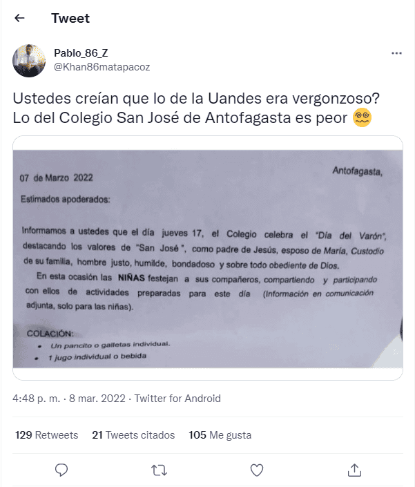 El colegio San José de Antofagasta (Chile) se ha convertido en el blanco de críticas en las redes sociales luego de que se compartiera una fotografía de una circular dirigida a los padres de familia con relación a la próxima celebración del “Día del Varón”.El plantel chileno informa a los padres de familia y apoderados en dicha circular emitida el 7 de marzo de 2022 de la próxima celebración escolar, que inmediatamente comenzó a volverse viral entre los internautas que la consideraron polémica."Estimados apoderados: Informamos a ustedes que el día jueves 17, el Colegio celebra el "Día del Varón", destacando los valores de "San José", como padre de Jesús, esposo de María, Custodio de su familia, hombre justo, humilde, bondadoso y sobre todo obediente de Dios", se lee en la misiva."En esta ocasión las NIÑAS festejan a sus compañeros, compartiendo y participando con ellos de actividades preparadas para este día (Información en comunicación adjunta, solo para las niñas)", continúa.Las reacciones y críticas no se hicieron esperar en Twitter, en donde algunos usuarios condenaron la práctica de dicha conmemoración, mientras que otros se sumaron al debate especificando que dicha actividad es de carácter religioso al interior de la escuela."Es algo religioso, lo hacen con los Josés y Marías, una cosa religiosa. Jamás meter a tus prole en una escuela así si no eres religioso, puro cacho", indica Supay de la perla; "Fuera de contexto. Esa wea se hace al revés también. Día de la Mujer... los niños le hacen una sorpresa a las niñas; bailes, tarjetas y esas cosas", indica PUMA ÁCIDO en respuesta a Pablo_86_Z, quien compartió dicha imagen con el mensaje “Ustedes creían que lo de la Uandes era vergonzoso? Lo del Colegio San José de Antofagasta es peor" en Twitter.Pese a la aclaración de algunos exalumnos sobre el carácter religioso de la celebración escolar, muchos usuarios condenaron al colegio y a su personal por fomentar dicha práctica. Hasta el momento no se ha emitido un mensaje por parte del plantel en respuesta a la opinión en redes sociales.