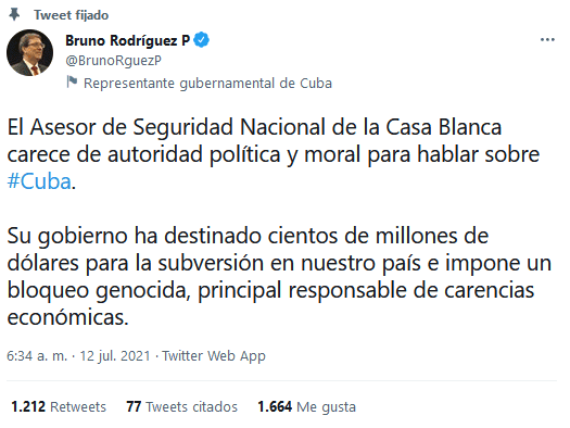 El presidente cubano, Miguel Díaz-Canel, acusó el lunes a Washington de imponer "una política de asfixia económica para provocar estallidos sociales en el país", un día después de las históricas manifestaciones, mientras que el mandatario estadounidense, Joe Biden, le pidió que "escuche a su pueblo".En una transmisión en directo en televisión y radio, el dirigente comunista, rodeado de varios de sus ministros, aseguró que su gobierno trata de "enfrentar y vencer" las dificultades ante las sanciones de Estados Unidos, reforzadas desde el mandato de Donald Trump."¿Qué quieren con estas situaciones?, provocar estallidos sociales, provocar incomprensiones" entre los cubanos, pero también "el famoso cambio de régimen", denunció el presidente.Los impulsores de las protestas "tuvieron la respuesta que merecían y la seguirán teniendo, como en Venezuela", un gran aliado de Cuba, añadió.Biden pidió al "régimen cubano que, en lugar de enriquecerse, escuche a su pueblo y atienda sus necesidades", indicó en un comunicado."Estamos con el pueblo cubano y su claro llamado a la libertad", dijo.El internet móvil, que llegó a Cuba a finales de 2018 y permitió la transmisión en vivo de unas 40 protestas antigubernamentales en toda la isla el domingo, seguía cortado el lunes por la mañana.Miles de cubanos, hartos de la crisis económica, que ha agravado la escasez de alimentos y medicinas y ha obligado al gobierno a cortar la electricidad durante varias horas al día, salieron espontáneamente a la calle el domingo en decenas de ciudades y pueblos de todo el país, al grito de "Tenemos hambre", "Libertad" y "Abajo la dictadura".Una movilización sin precedentes en Cuba, donde las únicas concentraciones autorizadas suelen ser las del Partido Comunista (PCC-único).Si bien Díaz-Canel reconoció el descontento de algunos cubanos, dio a los revolucionarios "la orden de combate", para que "salgan a las calles donde quiera que se vayan a producir estas provocaciones".Ante esto, e l domingo por la noche, el gobierno de Estados Unidos había advertido a las autoridades cubanas contra el uso de la violencia contra "manifestantes pacíficos"."Estados Unidos apoya la libertad de expresión y reunión en Cuba y condenaría fuertemente cualquier uso de la violencia contra manifestantes pacíficos que están ejerciendo sus derechos universales", señaló en Twitter el asesor de Seguridad Nacional del gobierno estadounidense, Jake Sullivan."El Asesor de Seguridad Nacional de la Casa Blanca carece de autoridad política y moral para hablar sobre #Cuba", reaccionó el lunes en Twitter el canciller cubano, Bruno Rodríguez."Su gobierno ha destinado cientos de millones de dólares para la subversión en nuestro país e impone un bloqueo genocida, principal responsable de carencias económicas", añadió.Tras una breve reconciliación entre 2014 y 2016, las relaciones diplomáticas entre Cuba y Estados Unidos están en su nivel más bajo desde que Donald Trump endureció el embargo en vigor desde 1962, denunciando violaciones de derechos humanos y apoyo de La Habana al gobierno de Nicolás Maduro en Venezuela.Estas sanciones, así como la ausencia de turistas debido a la pandemia, han sumido a Cuba en una profunda crisis económica y han generado un fuerte malestar social, seguido de cerca en Washington y el continente americano.GC