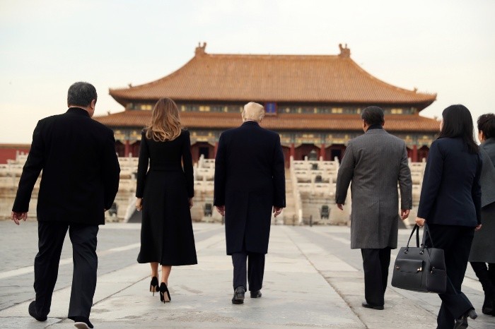 El presidente estadounidense, Donald Trump, y su esposa Melania fueron recibidos en la Ciudad Prohibida, el antiguo palacio imperial chino, por su homólogo Xi Jinping y la primera dama, Peng Liyuan, dando comienzo a la agenda del mandatario norteamericano en Pekín.Los dos matrimonios pasearon por los gigantescos y adoquinados patios del palacio, construido en el siglo XV, y que fue residencia de los soberanos chinos y centro de poder en las dinastías Ming y Qing (hasta 1911).En un recinto que en días festivos o fines de semana puede recibir cientos de miles de visitantes, pero que fue vaciado para la ocasión para seguridad y disfrute de la pareja estadounidense, los Trump y sus anfitriones posaron ante los fotógrafos (uno de ellos tropezó con un adoquín rompiendose su cámara y sus gafas).Xi y Peng, una famosa soprano en su país, vestidos con abrigos grises, mostraron a los Trump, ambos de negro riguroso, las distintas estancias imperiales, tras lo cual se prevé que los cuatro asistan en el mismo palacio a un espectáculo de ópera y tengan un banquete privado.Los Trump llegaron a la Ciudad Prohibida directamente desde el aeropuerto internacional de la capital, tras volar desde la base aérea de (Osan) Corea del Sur.A bordo de un Cadillac blindado, encabezaron una comitiva de un centenar de vehículos que llegó al centro de Pekín circulando por la famosa avenida Chang An (principal arteria de la ciudad) cortada al tráfico.El recibimiento de Xi y su esposa al matrimonio Trump es poco habitual en visitas de Estado en China, ya que tradicionalmente los líderes extranjeros se encuentran con el mandatario chino y la primera dama en un recinto de aires mucho más comunistas, el Gran Palacio del Pueblo, sede del Legislativo.Xi y Trump, en todo caso, se darán cita en ese lugar mañana, jueves, en la reunión de trabajo que mantendrán las dos delegaciones, donde se espera que las dos principales potencias firmen importantes acuerdos comerciales.