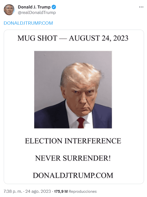 El expresidente Donald Trump volvió a "X", antes llamada Twitter, publicando su primer mensaje en más de dos años y medio poco después de que se entregó a las autoridades en una cárcel de Atlanta por cargos de conspirar para revertir su derrota electoral.Publicó su foto de prontuario y el mensaje: "Interferencia electoral. ¡Nunca rendirse!", junto con un vínculo a su página web, el cual dirige al usuario a una página de recaudación de fondos.Fue la primera publicación de Trump desde el 8 de enero de 2021, cuando Twitter suspendió indefinidamente su cuenta, argumentando temores de que pudiera incitar a más actos de violencia después del asalto al Capitolio federal. Su cuenta fue restablecida en noviembre pasado, poco después de que Elon Musk tomó las riendas de la compañía. Pero Trump se había abstenido de tuitear, insistiendo en que se sentía mejor en su propia plataforma Truth Social, la cual lanzó durante la prohibición.Trump, quien actualmente aventaja los sondeos por la nominación presidencial republicana, ha dicho durante meses que planeaba volver a la plataforma en el "momento adecuado", según una persona al tanto de sus comentarios y que habló bajo condición de anonimato al no estar autorizada a difundir conversaciones privadas. La publicación de Trump se produjo mientras viajaba en su avión privado de regreso a su casa de Nueva Jersey desde Atlanta la noche del jueves.De momento se desconoce si la publicación fue cosa de una vez, o si pretende seguir publicando con frecuencia en "X". Horas antes había publicado el mismo mensaje en Truth Social y continuó promoviendo la plataforma la noche de ayer jueves."Amo Truth Social. Es mi casa", escribió.Sin embargo, el mensaje representó un regreso a casa de Trump a una de sus más importantes plataformas, una que utilizó para dominar a sus rivales en las primarias de 2016 y para tomar las riendas del ciclo de noticias durante años. Trump a menudo se jactó de lo rápido que sus mensajes llegaban desde su cuenta a las estaciones de noticias con el cintillo de "noticia de último minuto".Un día antes, Trump se ausentó del primer debate republicano, eligiendo en su lugar grabar una entrevista con el expresentador de Fox News Tucker Carlson, misma que fue publicada en X como contrapeso al debate.Su regreso a "X" con lo que fue, en esencia, un mensaje de recaudación de fondos, es también un reflejo de cuánto dinero ha estado gastando la campaña de Trump en abogados mientras enfrenta cargos penales en cuatro jurisdicciones. La operación política de Trump ingresó a la segunda mitad del año en apuros financieros debido a que su cuenta bancaria se ha visto exprimida con decenas de millones de dólares destinados a defender al expresidente y sus aliados.Trump tiene 86.6 millones de seguidores en "X", superando ampliamente a sus rivales en la contienda de 2024.Pero la plataforma se ha sometido a cambios importantes desde la partida de Trump, incluido un cambio de nombre.Trump volvió a Facebook en marzo publicando "¡Estoy de regreso!" semanas después de que se reactivara su cuenta personal.Pero se ha mantenido con Truth Social, una plataforma similar a Twitter que lanzó después de que fuera suspendido de Twitter y Facebook, para publicar transmisiones diarias de misivas y anuncios, entre otras cosas. Eso incluye el uso de la plataforma para dar a conocer noticias sobre sus acusaciones formales y planes de entrega en momentos en que se acumulan los problemas legales en su contra.Como parte del pacto con Digital World Acquisition Corp. para convertir a Truth Social en una empresa pública, Trump había accedido -con el fin de no competir contra su propia empresa- que sería el "primer canal" para "cualquier y todas las comunicaciones y mensajes en redes sociales desde su perfil personal", según un documento presentado ante la Comisión de Bolsa y Valores de Estados Unidos.Ello incluyó una cláusula de exclusividad bajo la cual el presidente estaba "obligado en términos generales a usar Truth Social para todas sus publicaciones en redes sociales y sin poder publicarla en otra plataforma de redes sociales por seis horas" durante un periodo de 18 meses, a partir del 22 de diciembre de 2021. Dicho periodo concluyó en junio.OF