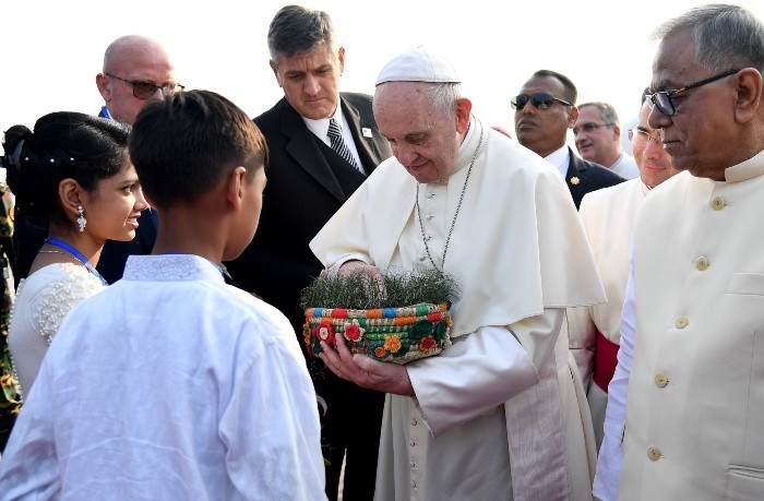 El Papa Francisco llegó hoy en visita oficial de tres días a Bangladesh, un país de amplia mayoría musulmana, procedente de la vecina Birmania (Myanmar), en un viaje que estará marcado por la crisis de refugiados rohinyás.El Papa llegó al aeropuerto internacional de Dacca al filo de las 15:00, hora local (9:00 GMT), donde fue recibido con honores por el presidente de Bangladesh, Abdul Hamid, y una ceremonia en la que sonaron los himnos protocolarios.Francisco, que permaneció en el aeropuerto alrededor de 20 minutos, también presenció una actuación musical, con el baile tradicional de un grupo de niñas.El Papa llega a Dacca en la segunda visita a Bangladesh de un Pontífice desde la independencia del país en 1971, tras la del Papa Juan Pablo II en 1986.Precisamente el Pontífice hará su primera parada en Bangladesh en el Memorial de los Mártires en Savar, a las afueras de la capital, donde se rinde tributo a los caídos en esa contienda.A continuación, Francisco se desplazará al museo del Padre de la Nación Bangabandhu ("Amigo de Bengala"), un apelativo con el que se conoce a Sheikh Mujibur Rehman, primer presidente de Bangladesh asesinado en un golpe militar en 1975 y padre de la actual primera ministra, Sheikh Hasina.El segundo día, parte central del viaje, el Papa oficiará una misa ante alrededor de 80 mil fieles en el parque Suhrawardy Udyan, donde serán ordenados además 16 sacerdotes.Durante esa jornada, el Papa tiene previsto reunirse con la primera ministra y encabezar un acto interreligioso y ecuménico por la paz en el Arzobispado de Dacca, entre otros actos.Es en ese acto interreligioso donde se espera que el Papa se reúna con un grupo de refugiados rohinyá, parte de los más de 620 mil miembros de esta minoría musulmana huidos de la vecina Birmania tras el estallido de violencia del pasado 25 de agosto.Durante su viaje en Birmania, Francisco evitó referirse explícitamente a los rohinyá, con llamadas generales a la reconciliación del país, y la defensa de las minorías y los derechos humanos, para evitar algún tipo de represalia contra los católicos.En Bangladesh, sin embargo, es ese aspecto del viaje el que genera más expectación entre la mayoría musulmana, deseosos de que el Papa se posicione claramente del lado de los rohinyá.
