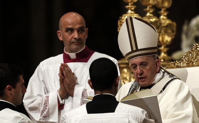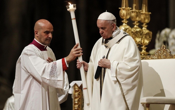 El Papa Francisco hizo hoy un llamamiento para que los seres humanos superen el miedo, la cerrazón y la desolación, elementos que acaban con la esperanza, durante la homilía que pronunció en la Vigilia Pascual de este Sábado Santo.El Pontífice pidió que las personas pasen "de la cerrazón a la comunión, de la desolación a la consolación, del miedo a la confianza", durante este rito de Semana Santa que se celebró en una Basílica de San Pedro repleta de fieles.La ceremonia comenzó a las 20:30 hora local con la basílica totalmente en penumbra y en silencio, para conmemorar el dolor de la muerte del Señor.El rito dio inicio con la bendición del fuego y después el Papa incidió con un punzón sobre el cirio pascual, símbolo de Cristo, "Luz del Mundo".Grabó una cruz y también la primera y la última letra del alfabeto griego -alfa y omega-, junto con las cifras del año en curso.Lo hizo mientras pronunciaba a la vez en latín: "Christus heri et hodie, Principium et Finis, Alpha et Omega, ipsius sunt tempora et saecula. Ipsi gloria et imperium per universa aeternitatis saecula" (Cristo ayer y hoy, principio y fin, alfa y omega. A Él pertenece el tiempo y los siglos, a Él la gloria y el poder por los siglos de los siglos).Después Jorge Bergoglio recorrió en procesión la basílica en total oscuridad, en representación de la ausencia de luz tras la muerte de Jesucristo, mientras los fieles iban encendiendo poco a poco las velas que habían llevado a la ceremonia, con la llama procedente del cirio pascual.El Papa llegó momentos después al altar mayor, la basílica se iluminó y un diácono comenzó entonces el canto del "Exultet", el himno pascual, un recorrido sintético de la historia de la salvación.El Papa dedicó su homilía a hablar de las que llamó cuatro grandes piedras de la vida de los seres humanos, "contra las que se estrellan las esperanzas y las expectativas: la muerte, el pecado, el miedo, la mundanidad"."A menudo la esperanza se ve obstaculizada por la piedra de la desconfianza. Cuando se afianza la idea de que todo va mal y de que, en el peor de los casos, no termina nunca, llegamos a creer con resignación que la muerte es más fuerte que la vida y nos convertimos en personas cínicas y burlonas, portadoras de un nocivo desaliento", sostuvo."Piedra sobre piedra, construimos dentro de nosotros un monumento a la insatisfacción, el sepulcro de la esperanza. Quejándonos de la vida, hacemos que la vida acabe siendo esclava de las quejas y espiritualmente enferma. Se va abriendo paso así una especie de psicología del sepulcro: todo termina allí, sin esperanza de salir con vida", añadió.El pecado, dijo Francisco, es otra de las piedras que "a menudo sella el corazón" de los seres humanos, pues "seduce, promete cosas fáciles e inmediatas, bienestar y éxito, pero luego deja dentro soledad y muerte".Cargó también contra el miedo, que provoca, dijo, que las personas se queden encogidas en sus límites, y contra las "vanidades mundanas", como el dinero, la carrera, el orgullo y el placer, que no dejan ver lo verdaderamente importante de la vida.Francisco animó a los fieles a preguntarse hacia dónde caminan en sus vidas, y lamentó que a veces las personas se dirigen hacia sus problemas, que nunca faltan.La ceremonia sigue la tradición de los primeros años de la Iglesia católica, cuando los catecúmenos (adultos que aspiran al bautismo) eran bautizados en la noche de la Vigilia Pascual.En esta ocasión, el Papa Francisco, revestido con ornamentos blancos, bautizó a ocho personas, procedentes de Ecuador, Perú, Italia, Albania e Indonesia.La Vigilia Pascual o "Lucernario" es uno de los ritos más antiguos de la liturgia y se celebra en la noche del Sábado Santo que San Agustín llamó "madre de todas las vigilias", en alusión a la espera de la Resurrección del Hijo de Dios.Los ritos de la Semana Santa continuarán este domingo con la misa del Domingo de Resurrección, que presidirá el Papa Francisco en la plaza de San Pedro del Vaticano, y después el pontífice impartirá desde la logia central de la basílica de San Pedro la tradicional bendición "Urbi et Orbi" (A la ciudad y al mundo).JM